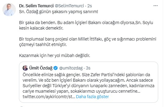 ''Sn. Özdağ günün şakasını yapmış sanırım! Bir şaka da benden. Bu adam İçişleri Bakanı olacağım diyorsa,Sn. Soylu kesin kalacak demektir. Bir toplumsal barış projesi olan Millet İttifakı, göç ve sığınmacı problemini çözmeyi taahhüt etmiştir. Kazanmak için her yol mübah değildir.'' paylaşımını sosyal medyadan dile getirerek tepkisini ortaya koydu.