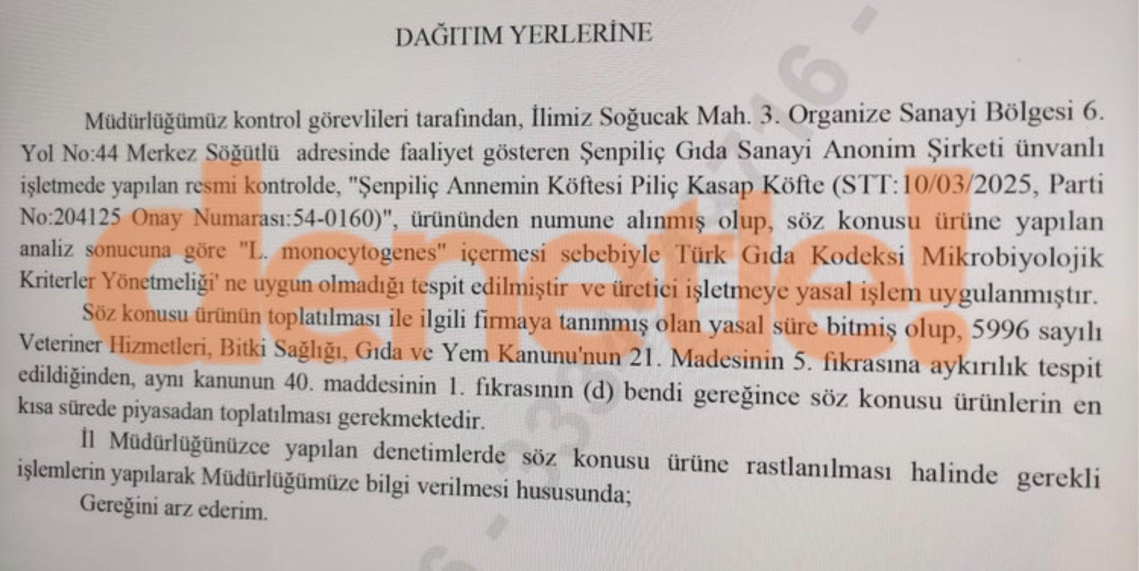Denetle'nin paylaştığı bilgilere göre: Tarım ve Orman Bakanlığı'nın gerçekleştirdiği son denetimlerde Türkiye'nin en büyük beyaz et üreticilerinden biri olan Şenpiliç'e ait bir üründe halk sağlığını tehdit eden ciddi bir bulguya ulaşıldı. Bakanlık, "Annemin Köftesi Piliç Kasap Köfte” adlı üründe insan sağlığı açısından son derece tehlikeli olan Listeria monocytogenes bakterisinin tespit edildiğini açıkladı.İçerisinde ölümcül bakteri tespit edilen ve toplatılma kararı alınan ürünün 2018 yılında yılın ürünü seçildiği ve Tüketici İnovasyon Ödülü aldığı ortaya çıktı.
