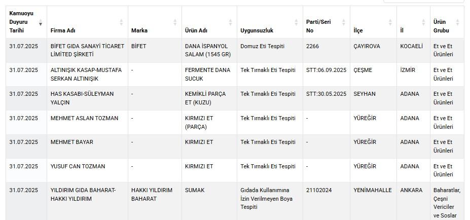 Bakanlığın güncellenen taklit-tağşiş listesinde sadece domuz eti değil, tek tırnaklı hayvan eti tespit edilen başka ürünler de yer aldı. İzmir'in Çeşme ilçesinde dana sucuğun içinde tek tırnaklı eti bulunduğu belirlenirken, Adana'nın Seyhan ve Yüreğir ilçelerinde faaliyet gösteren 4 farklı markanın kırmızı et ürünlerinde de aynı uygunsuzluğa rastlandı.