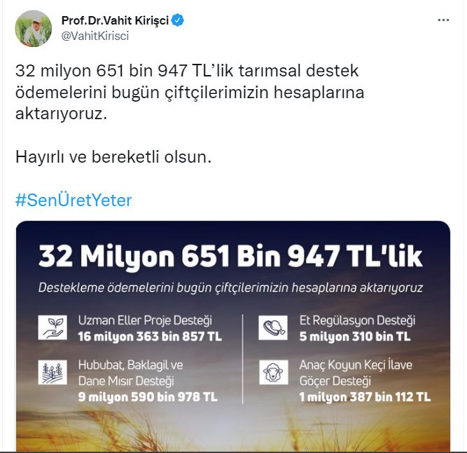 Kirişci, sosyal medya hesabından tarımsal destek ödemelerine ilişkin yaptığı paylaşımda, "32 milyon 651 bin 947 liralık tarımsal destek ödemelerini bugün çiftçilerimizin hesaplarına aktarıyoruz. Hayırlı ve bereketli olsun." ifadelerini kullandı.