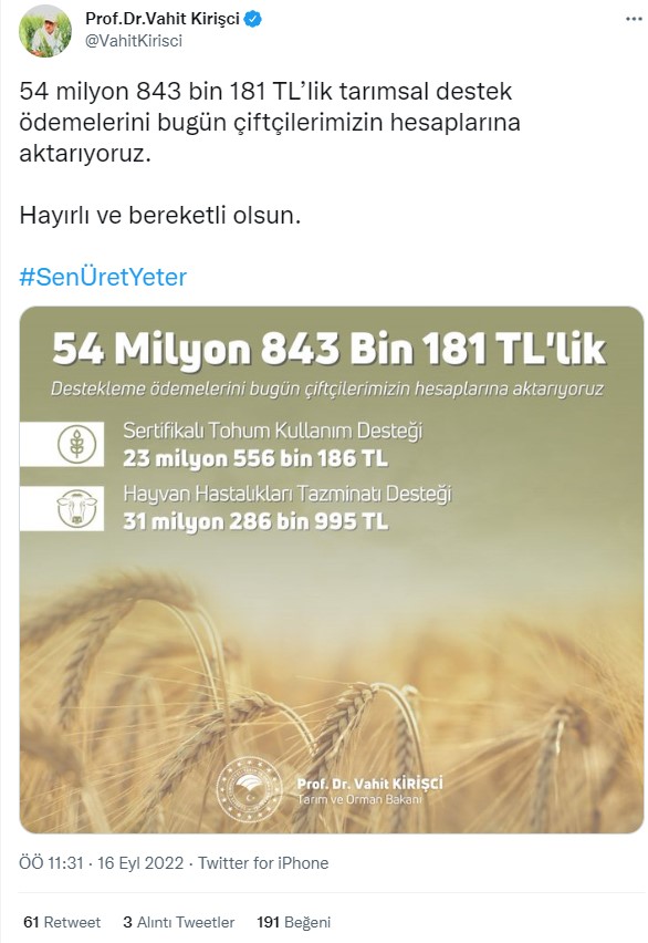 Bakan Kirişci: "54 milyon 843 bin 181 liralık tarımsal destek ödemelerini bugün çiftçilerimizin hesaplarına aktarıyoruz." açıklamasında bulundu.