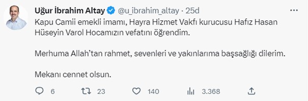 Konya Büyükşehir Belediye Başkanı Uğur İbrahim Altay sosyal medya hesabından ‘' Kapu Camii emekli imamı, Hayra Hizmet Vakfı kurucusu Hafız Hasan Hüseyin Varol Hocamızın vefatını öğrendim. Merhuma Allah'tan rahmet, sevenleri ve yakınlarıma başsağlığı dilerim. Mekanı cennet olsun.'' dedi.