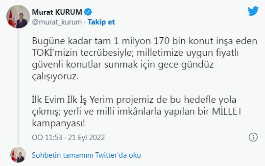 Çevre, Şehircilik ve İklim Değişikliği Bakanı Murat Kurum, sosyal medya hesabından yaptığı açıklamada, "Bugüne kadar tam 1 milyon 170 bin konut inşa eden TOKİ'mizin tecrübesiyle; milletimizin uygun fiyatlı güvenli konutlarda oturması için gece gündüz çalışıyoruz. ‘İlk Evim İlk İş Yerim' projemiz de bu hedefle yola çıkmış; yerli ve milli imkânlarla yapılan bir MİLLET kampanyası!