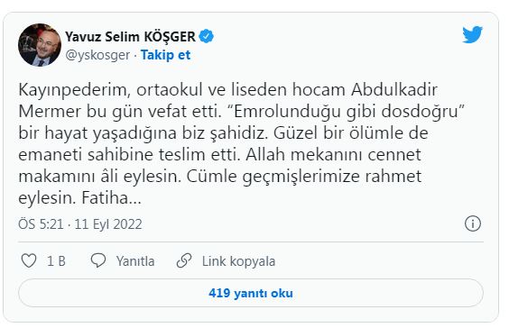 Acı haberi, İzmir'in Konyalı Valisi Yavuz Selim Köşger duyurdu. Köşger, sosyal medya hesabından yaptığı açıklamada, "Kayınpederim, ortaokul ve liseden hocam Abdulkadir Mermer bugün vefat etti. "Emrolunduğu gibi dosdoğru” bir hayat yaşadığına biz şahidiz. Güzel bir ölümle de emaneti sahibine teslim etti. Allah mekanını cennet makamını âli eylesin. Cümle geçmişlerimize rahmet eylesin. Fatiha…” ifadelerini kullandı.
