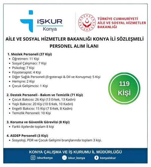 Yayınlanan ilanla birlikte kadro ve kontenjanlar netleşirken, Konya merkez ve ilçelerinde görevlendirilmek üzere toplam 119 personel alınacağı bildirildi.