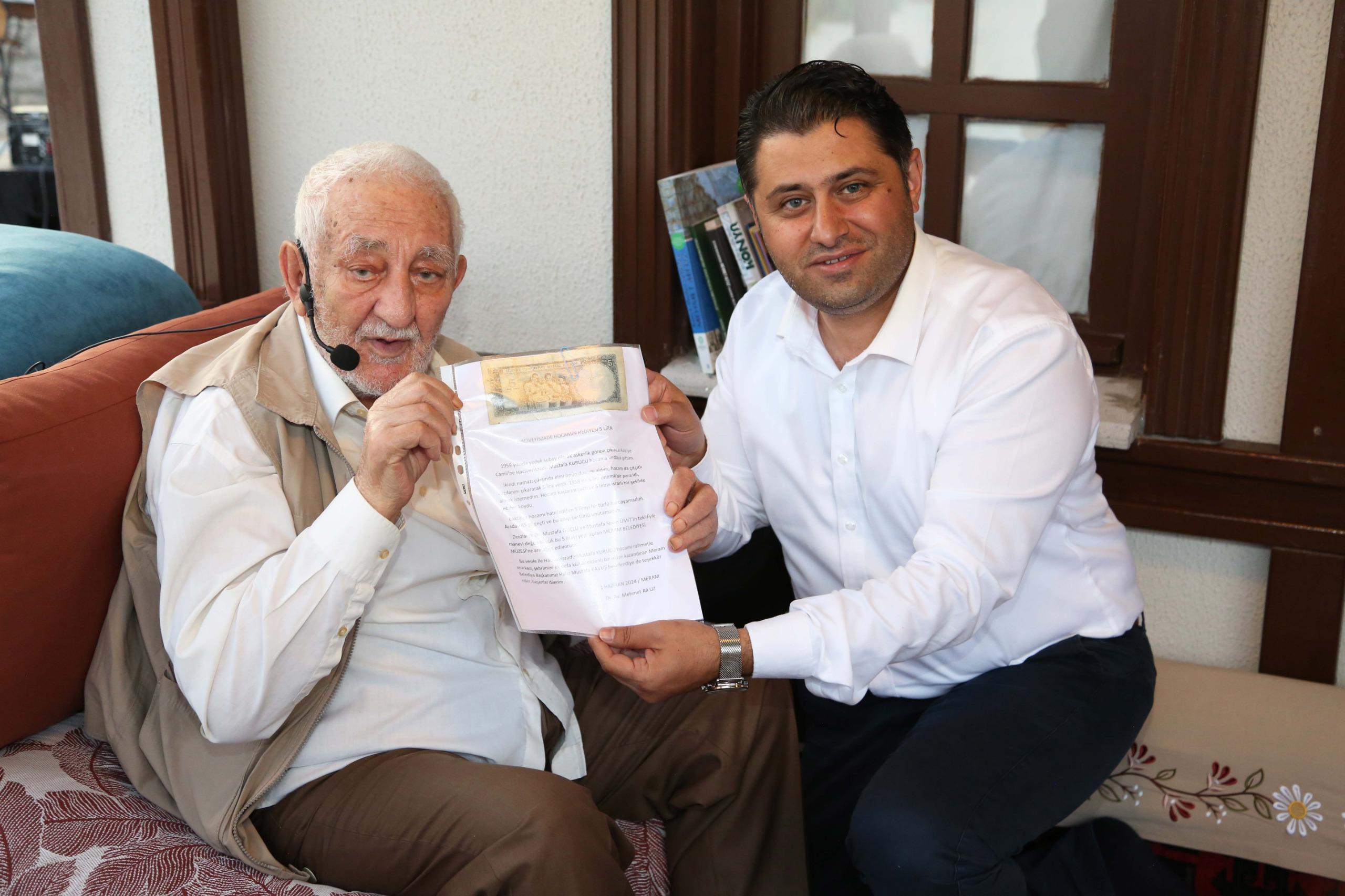 Hacıveyiszade Mustafa Kurucu ile bir anısını da anlatan Mehmet Ali Uz, sohbetini şöyle sürdürdü; "Herkes hocayı ziyaret ederdi. Askere giderken ben de ziyaret ettim. Aziziye Camii'nin önünde şadırvanda durdum, bekledim. Gelince askere gideceğimi söyledim, ‘Allahaısmarladık' dedim, elini öptüm. Çantasından beş lira çıkardı verdi. Almak istemedim. Çok öğrencisi vardı. Hepsine verse büyük para tutar. Kaşlarını çatınca aldım, sakladım. Onun hatırasısın yaşatmak ve gündemde tutmak adına bugün bu beş lirayı bu özel müzeye bağışlıyorum.”