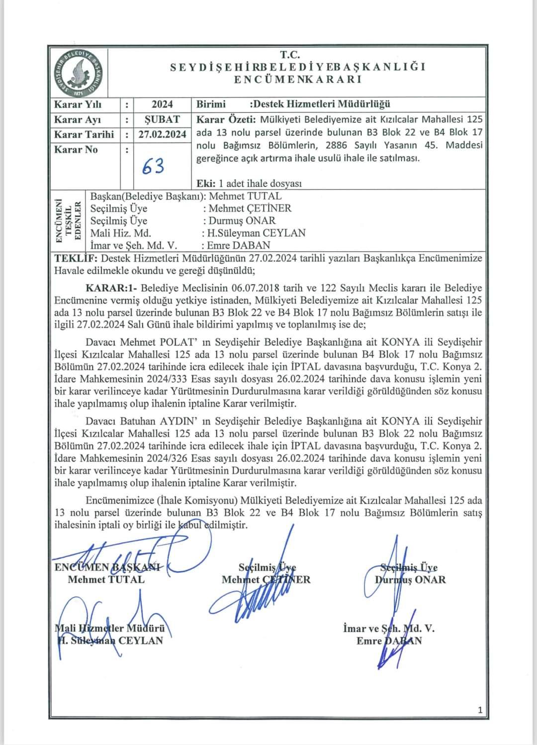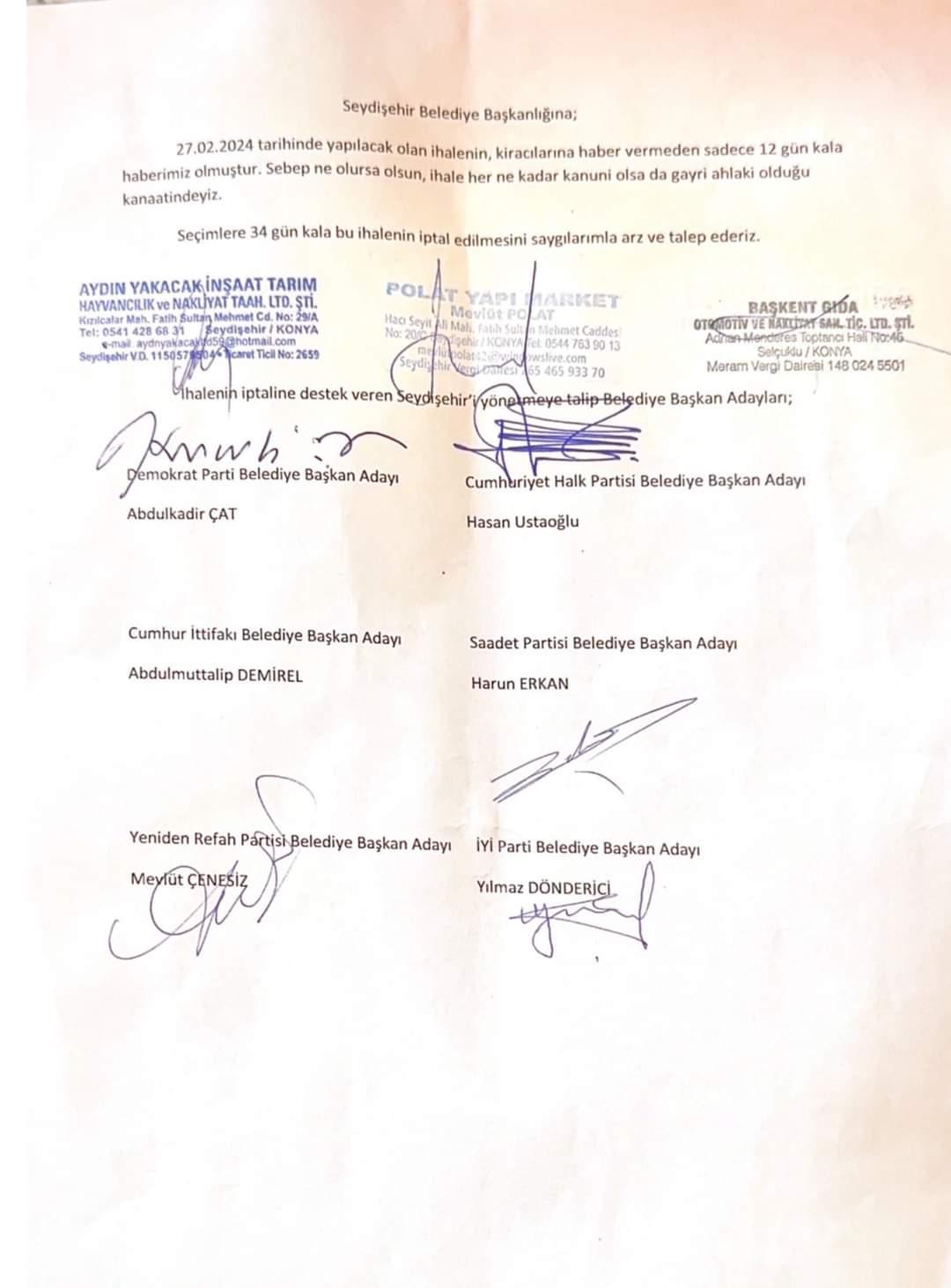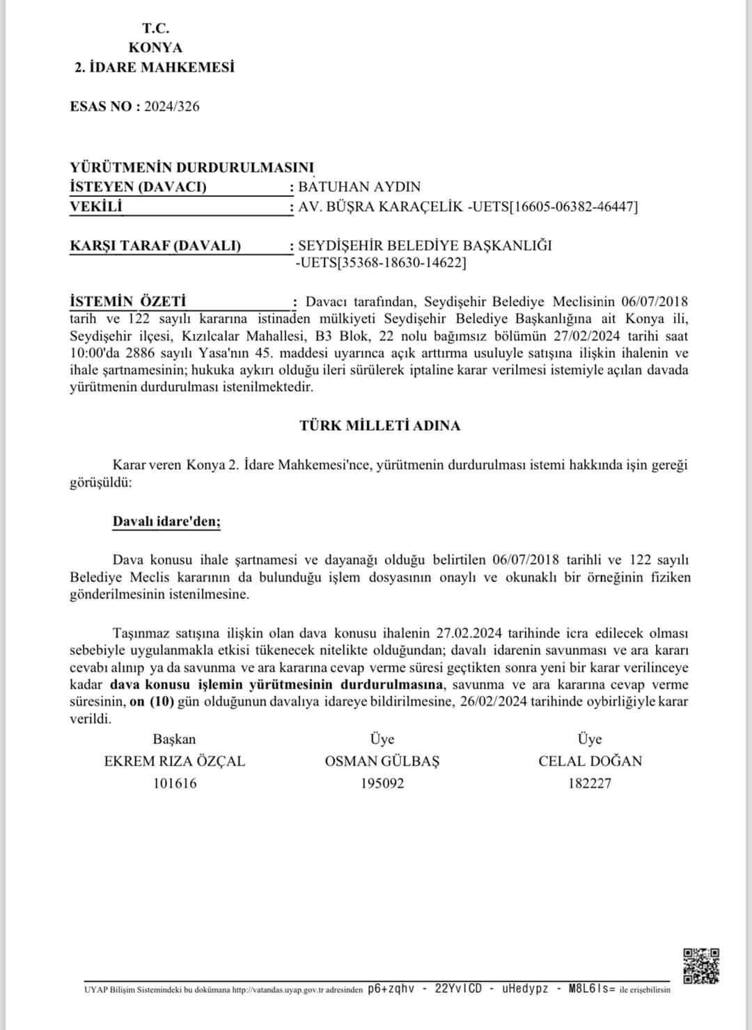 26 Şubat Tarihinde Konya 2. İdare Mahkemesi'ne başvurumuz sonucunda "Yürütmeyi durdurma” kararını alınarak ihale durdurulmuştur. Aynı gün mevcut belediye başkanı avukatlarımızı arayıp ihalenin iptali emrini verdiğini, davaya gerek kalmadığını beyan etmişlerdir. Yine aynı günün akşamı jet hızıyla encümen kararı ile ihale iptal edilmiştir.