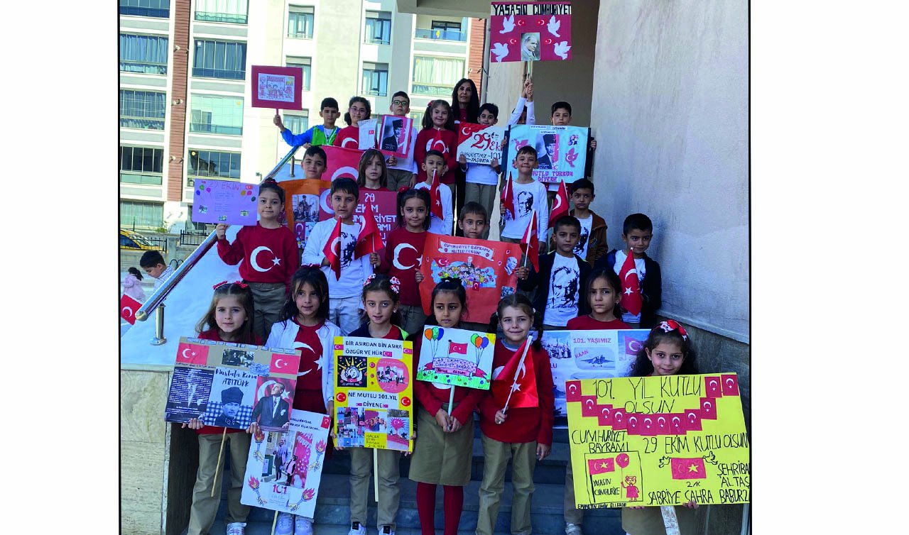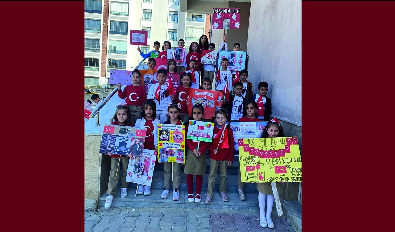 Cumhuriyetin 101. yıl dönümü dolayısıyla 2 K sınıfı Öğrencileri, öğretmen ve veliler, ellerindeki Türk bayraklarıyla marşlar söyledi.