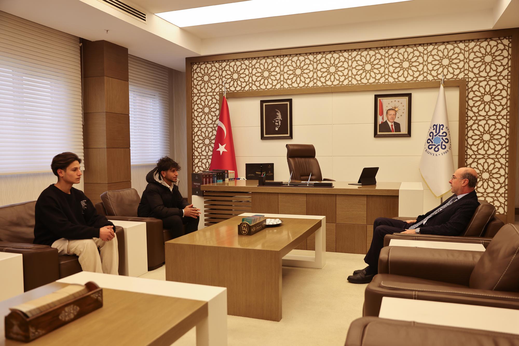 Selçuklu Belediye Başkanı Ahmet Pekyatırmacı, Selçuk Mahallesi'nde 4 katlı bina çökmeden önce durumu fark ederek tüm dairelerin kapılarını çalan ve insanların dışarı çıkmasını sağlayan Ali El Hüseyin ve kardeşi Hüssam El Hüseyin'i ağırladı.