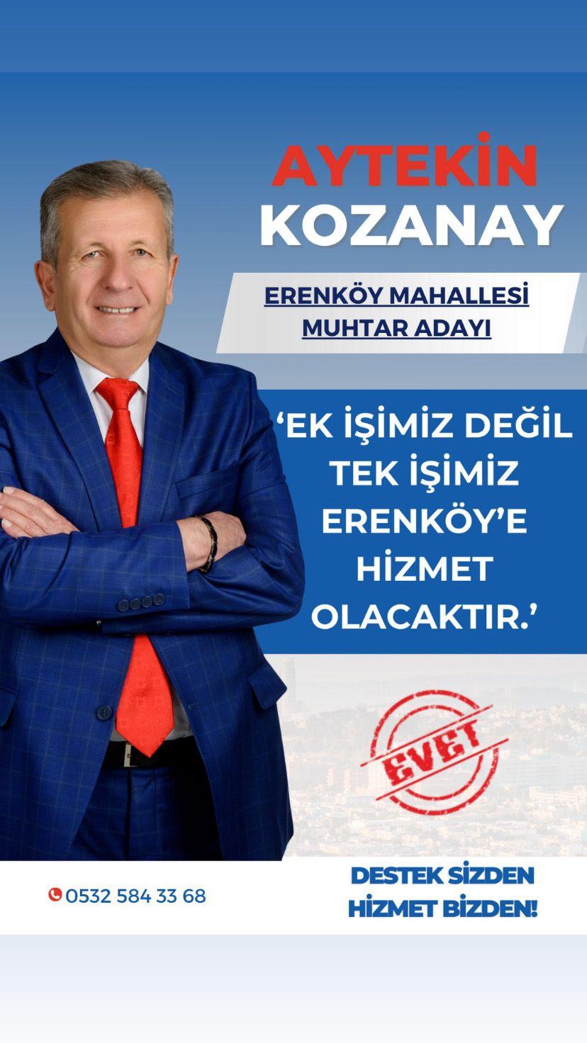 "Erenköy Mahallesi için gece gündüz çalışacağını söyledi. Kozanay, muhtar seçilirse birçok projeyi hayata geçireceğini belirtti. Erenköy mahallemize 31 Mart' tan sonra Allah izin verir de göreve gelirsek halkımıza isteklerini yerine getirmek için canla başla çalışacağız.Biz ziyaretlerimizde vatandaşlarımızın isteklerini not alıyoruz. Önceliğimiz mahallede yaşayan kadınlarımızın mahalle muhtarından isteği olan KOMEK dikiş nakış kursudur. Eğer göreve gelirsem KOMEK kurslarının açılması için gerekli yerlere başvurularımızı yapıp, mahallemize bu kursları kazandırmaya çalışacağım. dedi.