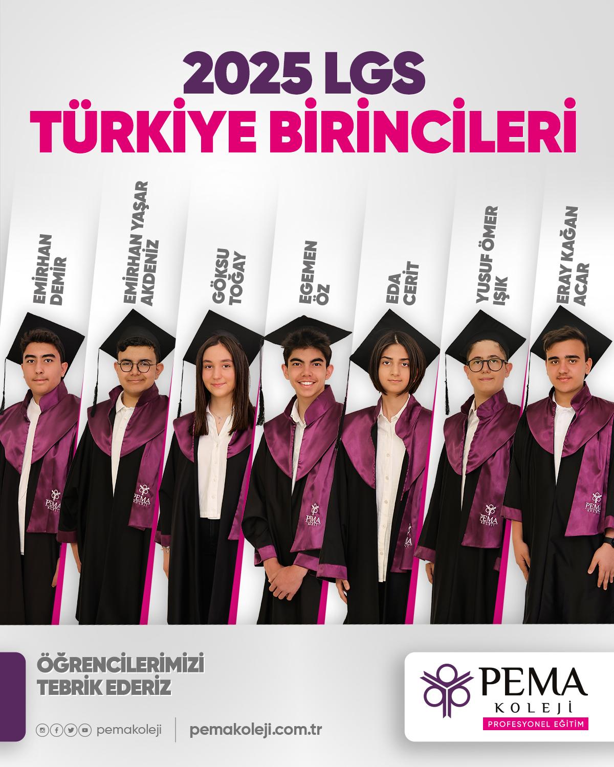 PEMA'nın başarılı öğrencileri Eda Cerit, Egemen Öz, Emirhan Demir, Emirhan Yaşar Akdeniz, Eray Kağan Acar, Göksu Toğay ve Yusuf Ömer Işık, 2025 LGS'de tüm soruları doğru yanıtlayarak 500 tam puanla Türkiye birinciliğini elde etti.