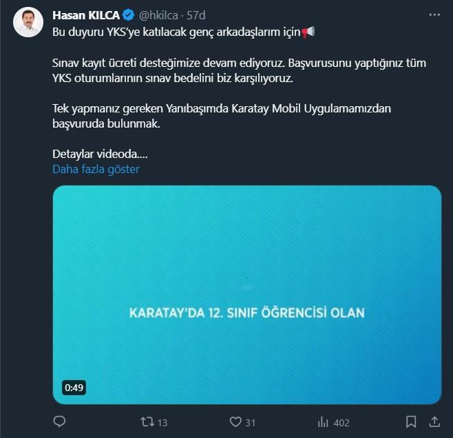 Karatay Belediye Başkanı Hasan Kılca üniversiteye hazrlanan gençlere müjdeyi verdi. Hasan Kılca sosyal medya hesaplarından: