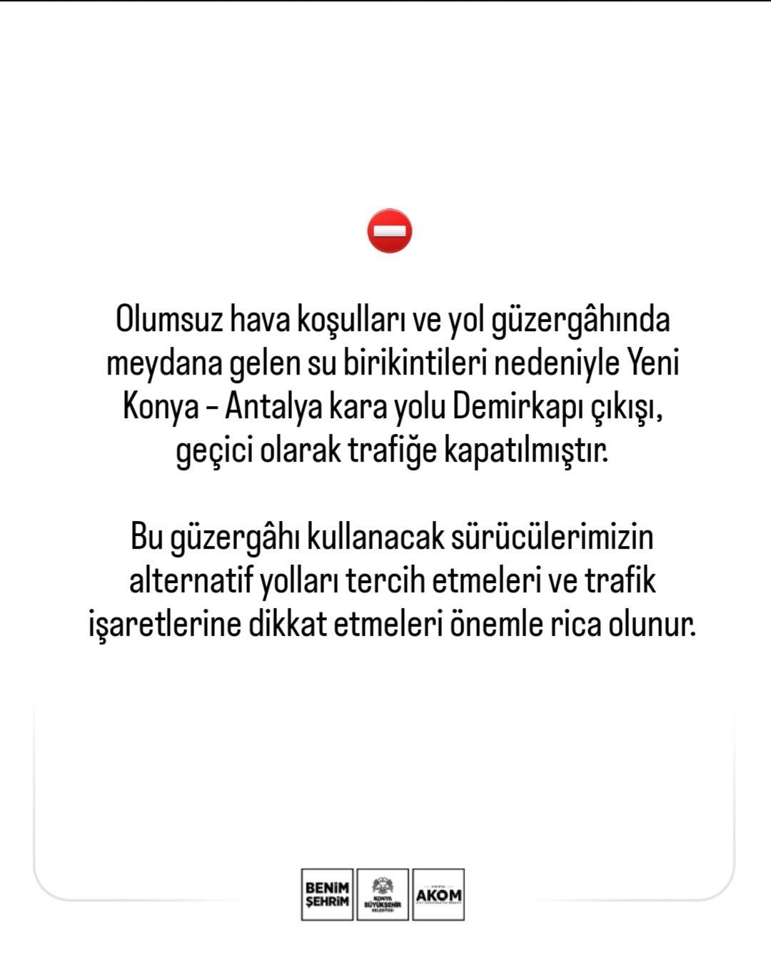 Konya Büyükşehir Belediyesi Afet Koordinasyon Merkezi (AKOM), olumsuz hava şartları nedeniyle önemli bir ulaşım aksında geçici trafik düzenlemesine gidildiğini duyurdu.