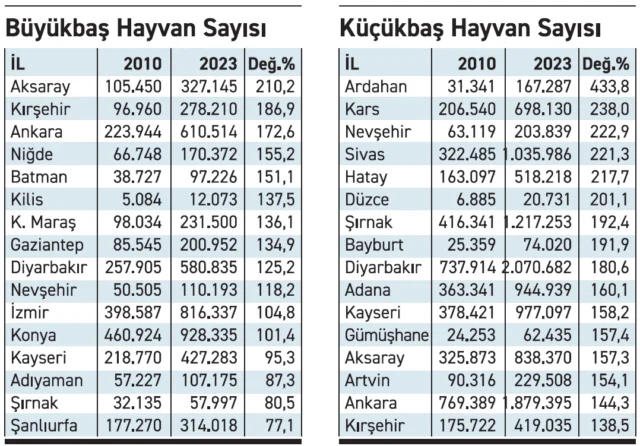 Bölgesel verilere göre, büyükbaş hayvancılık Orta Anadolu illerinde (Aksaray, Kırşehir, Ankara ve Niğde) giderek artan bir ilgi görüyor. Özellikle Aksaray, yüzde 210'luk artış oranıyla dikkat çekerken, Doğu Anadolu'da küçükbaş hayvancılık liderliğini sürdürüyor. Ardahan, yüzde 433 artışla küçükbaş hayvancılıkta zirvede yer alırken, Kars ve Erzurum da önemli artış oranlarıyla dikkat çekiyor.