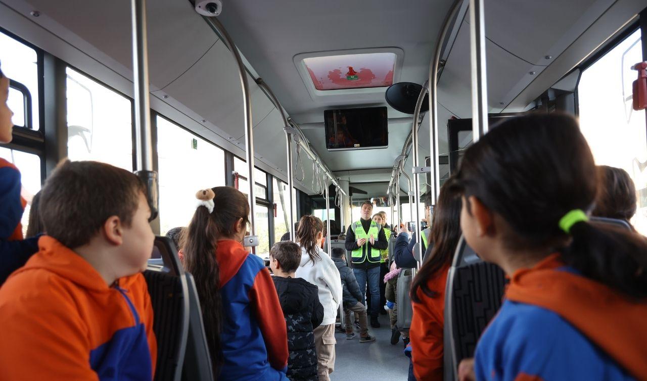 "Trafikte Nezaket ve Görgü Kuralları Projesi” kapsamında hayata geçirilen çalışmayla toplu ulaşımda kullanılmakta olan bir otobüs ile okullara gidilerek, otobüs içerisinde toplu ulaşımda nezaket ve görgü kuralları hakkında öğrencilere bilgilendirmeler yapılıyor.