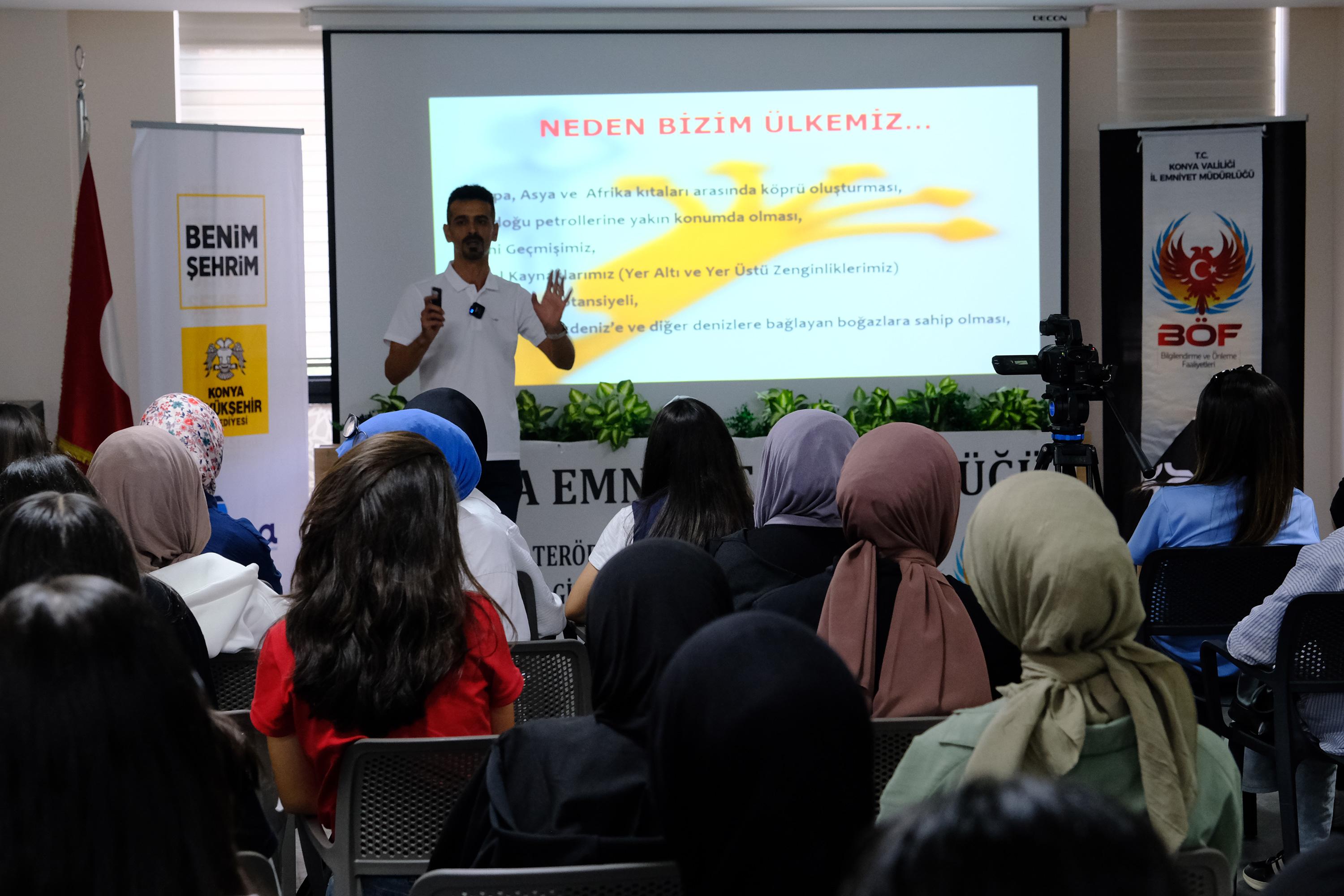 Konya Büyükşehir Belediyesi ile İl Emniyet Müdürlüğü'nün yaptığı ortak çalışma ile Büyükşehir Belediyesi'nin merkezde ve ilçelerde faaliyet gösteren Lise Medeniyet Akademileri'nde eğitim alan öğrencilere "Gençlik ve Güvenli Gelecek” adlı bilgilendirme seminerleri düzenleniyor. Terörle Mücadele birimleri tarafından verilen seminerlerde öğrencilerin terör örgütlerinin her türlü zararlı propaganda çalışmalarına ve tuzaklarına karşı bilinçlenmeleri sağlanıyor.