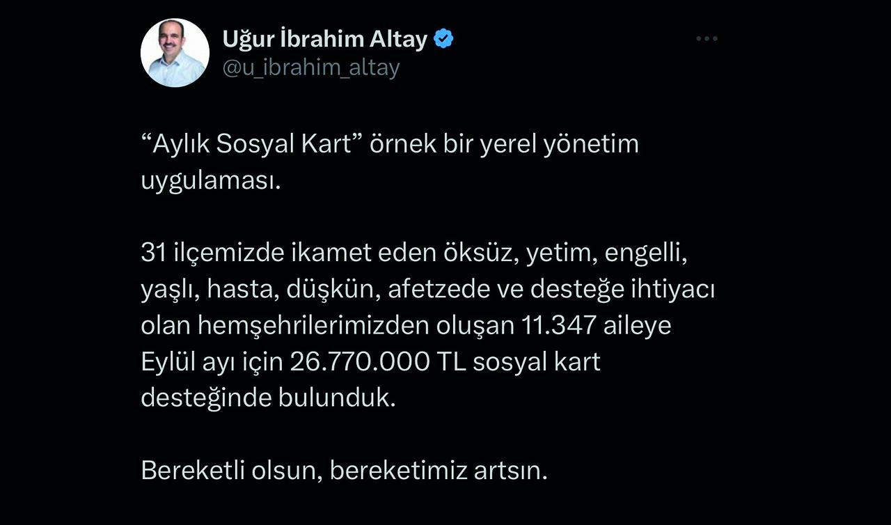 "Aylık Sosyal Kart” örnek bir yerel yönetim uygulaması. 31 ilçemizde ikamet eden öksüz, yetim, engelli, yaşlı, hasta, düşkün, afetzede ve desteğe ihtiyacı olan hemşehrilerimizden oluşan 11.347 aileye Eylül ayı için 26.770.000 TL sosyal kart desteğinde bulunduk. Bereketli olsun, bereketimiz artsın. İfadelerine yer verdi.