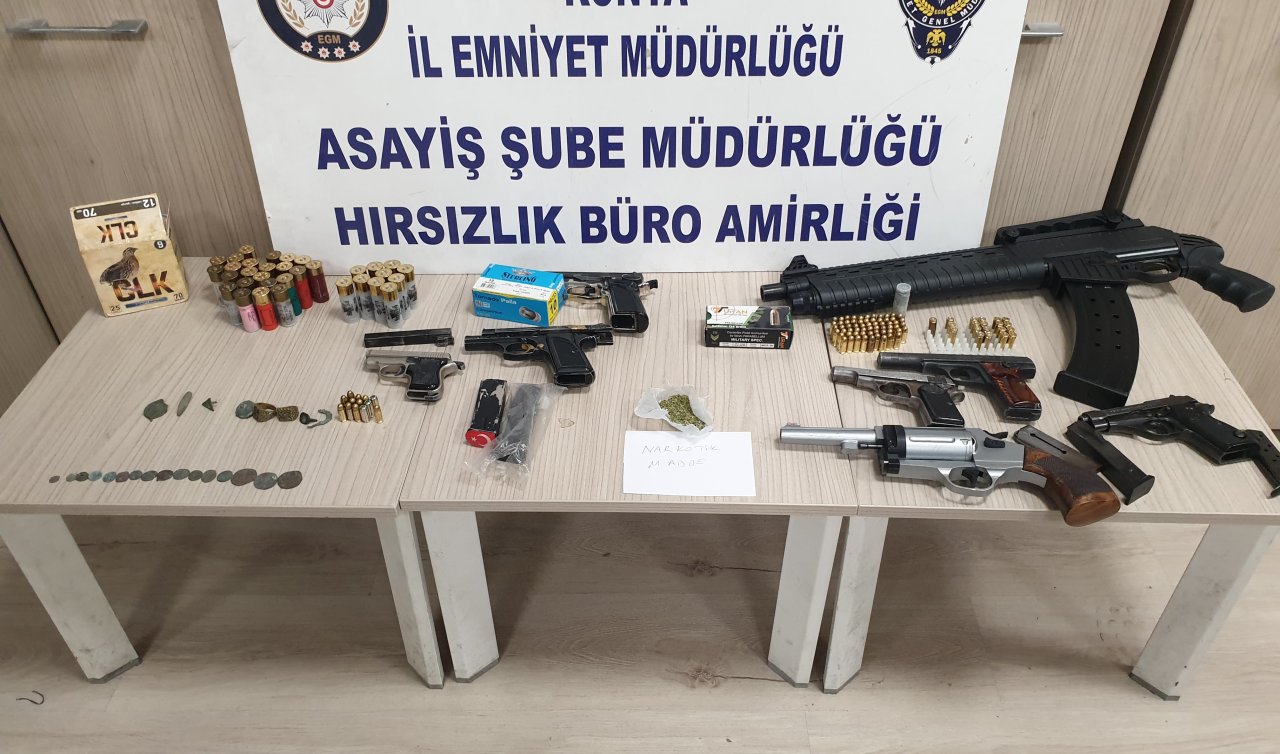 Konya'da hırsızlık şüphelilerinin evlerine baskın yapan polisler çok sayıda tabanca ve tarihi eser ele geçirirken 1 şüpheli tutuklandı.