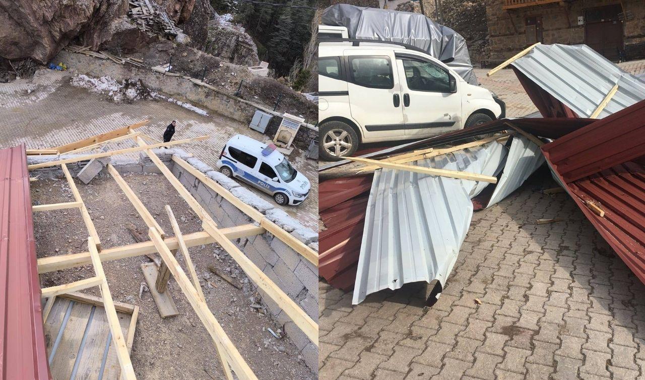 Taşkent Muzaffer Özlen İlkokulu ve Ortaokulu'nun çatısı, kuvvetli rüzgârın etkisiyle yerinden koparak uçtu.
