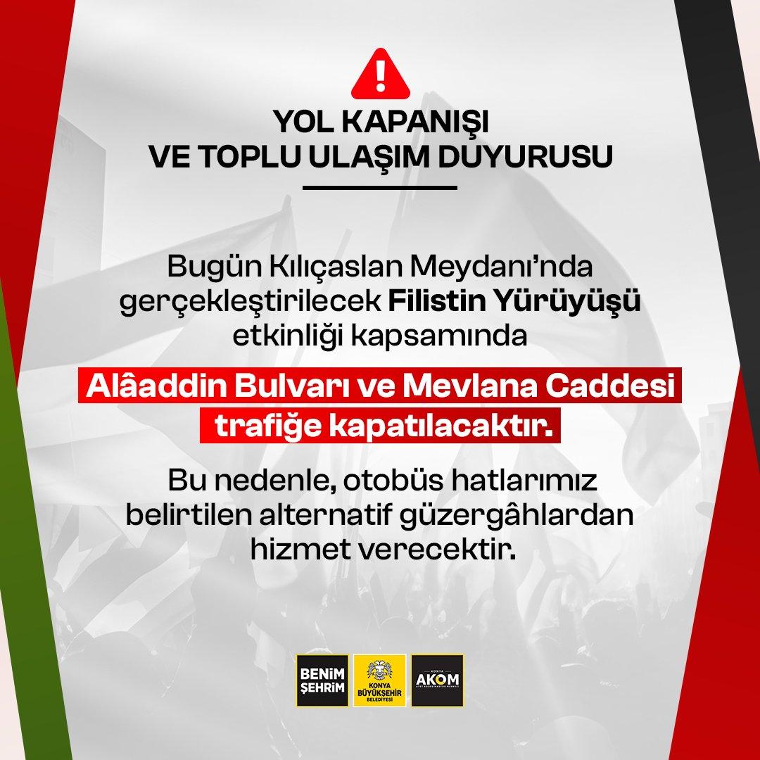 Yapılan açıklamada, ''Alâaddin Bulvarı ve Mevlana Caddesi'nin'' yürüyüş süresince araç trafiğine kapalı olacağı belirtilirken, bu bölgelerden geçen otobüs hatlarının alternatif güzergâhlar üzerinden seferlerine devam edeceği bildirildi.