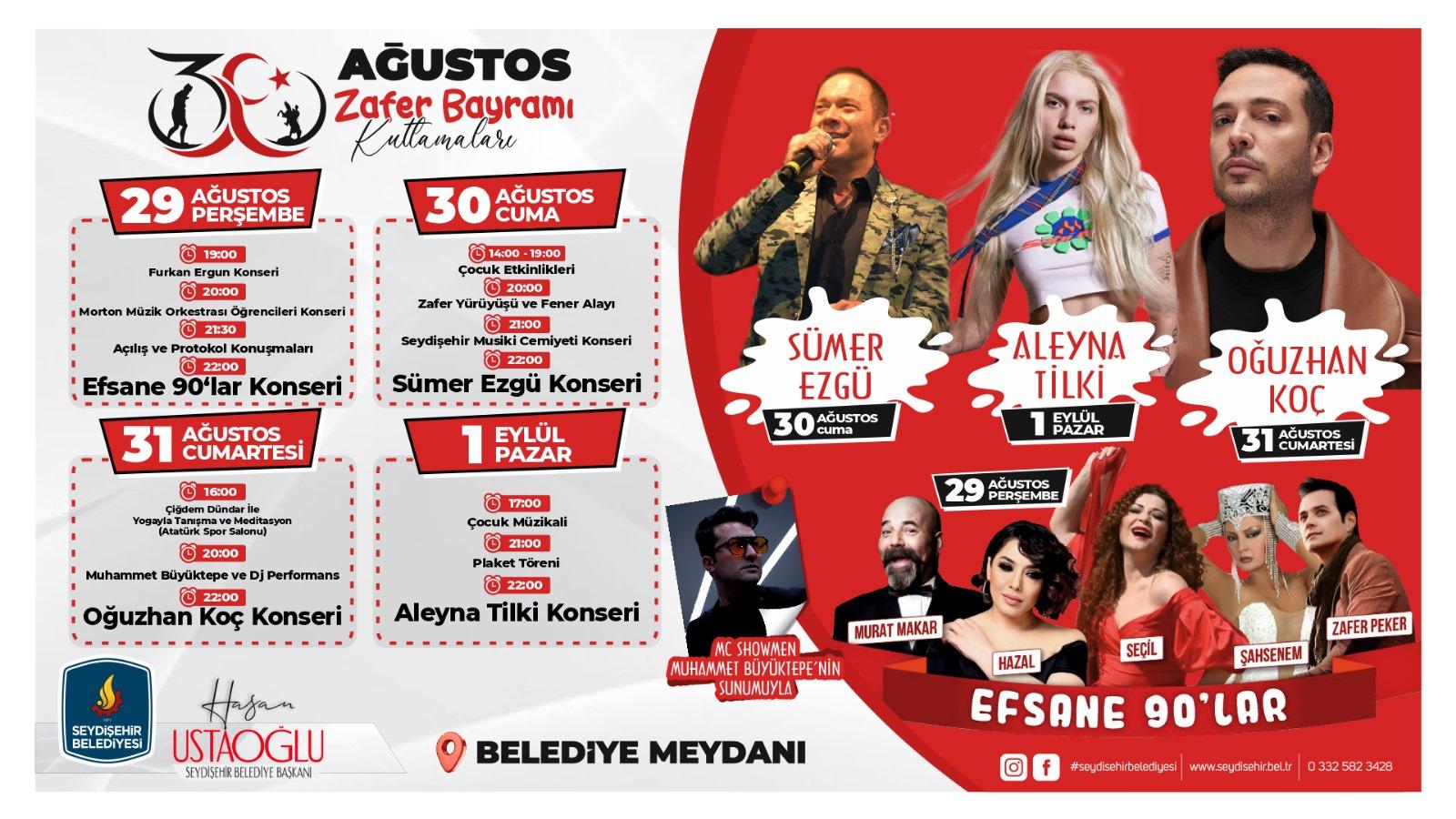 29 Ağustos- 1 Eylül tarihleri arasında Seydişehir'de düzenlenecek olan 30 Ağustos Zafer Bayramı kutlamaları ünlü sanatçıların katılımıyla Belediye Meydanında 4 gün olarak gerçekleştirilecek.