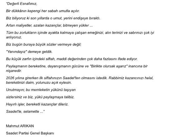 2026 yılına girerken esnafın ilk siftahının Saadet Partisi'nden olması arzusunun dile getirildiği mesajda, "Bu memleketin yükünü taşıyan sizlersiniz ve biz, bu yükü paylaşmaya talibiz” sözleriyle esnafa güçlü bir destek mesajı verildi.