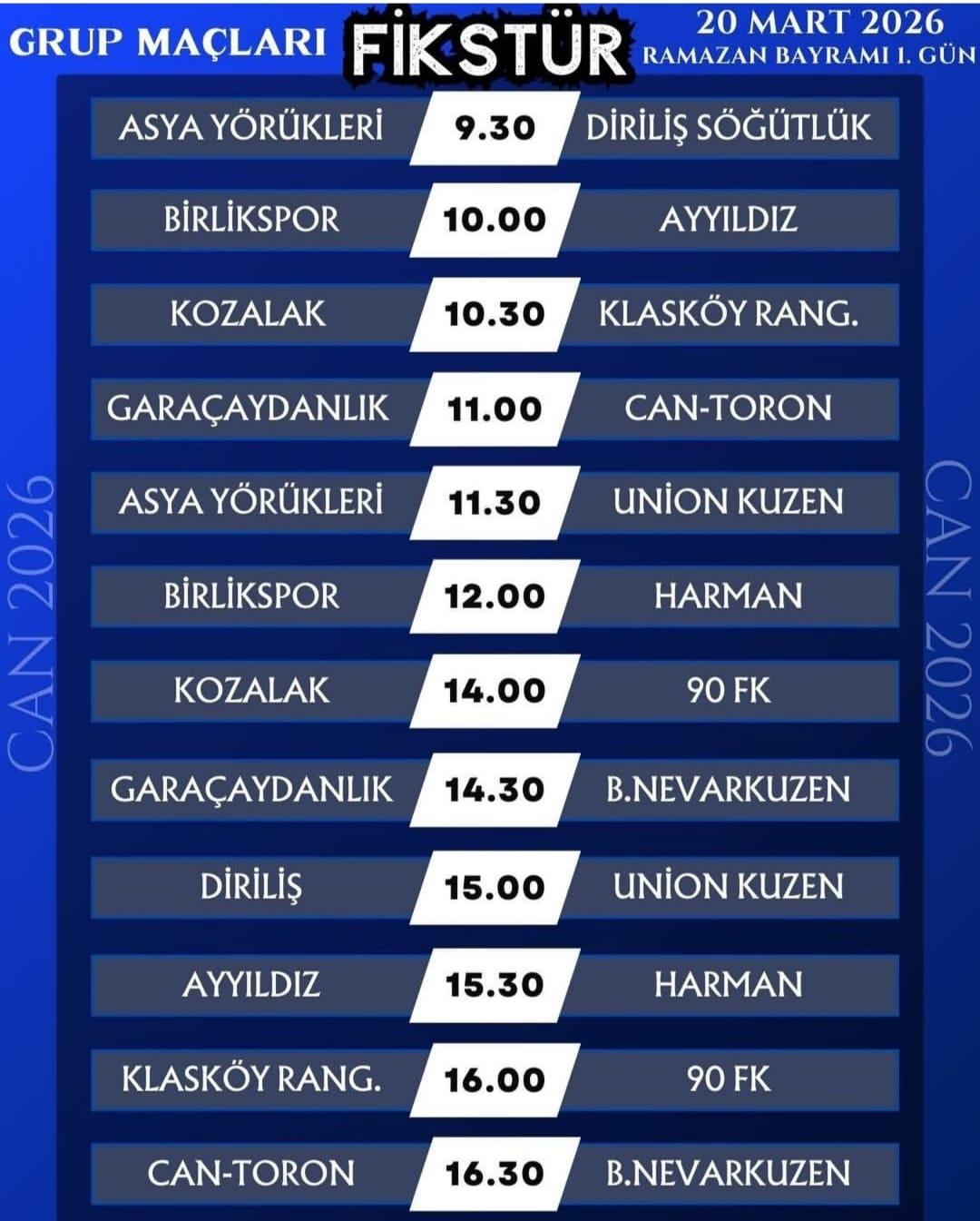 "CAN 2026” komitesi adıyla organizasyonu üstlenen gençler, tüm olumsuz hava şartlarına rağmen Bayramın 1. Günü turnuvanın grup başarıyla tamamlandı. Bayramın 2. Günü oynanacak olan çeyrek final yarı final ve final maçları ise yoğun kar yağışı nedeniyle ileri bir tarihe ertelendi. Komite adına yapılan açıklamada, "Yıllardır süregelen bu turnuvanın en büyük amacı muhabbetimizi, dostluğumuzu ve birlik beraberliğimizi yaşatmak. Kar, yağmur, çamur demeden son ana kadar mücadele ettik” ifadeleri kullanıldı.