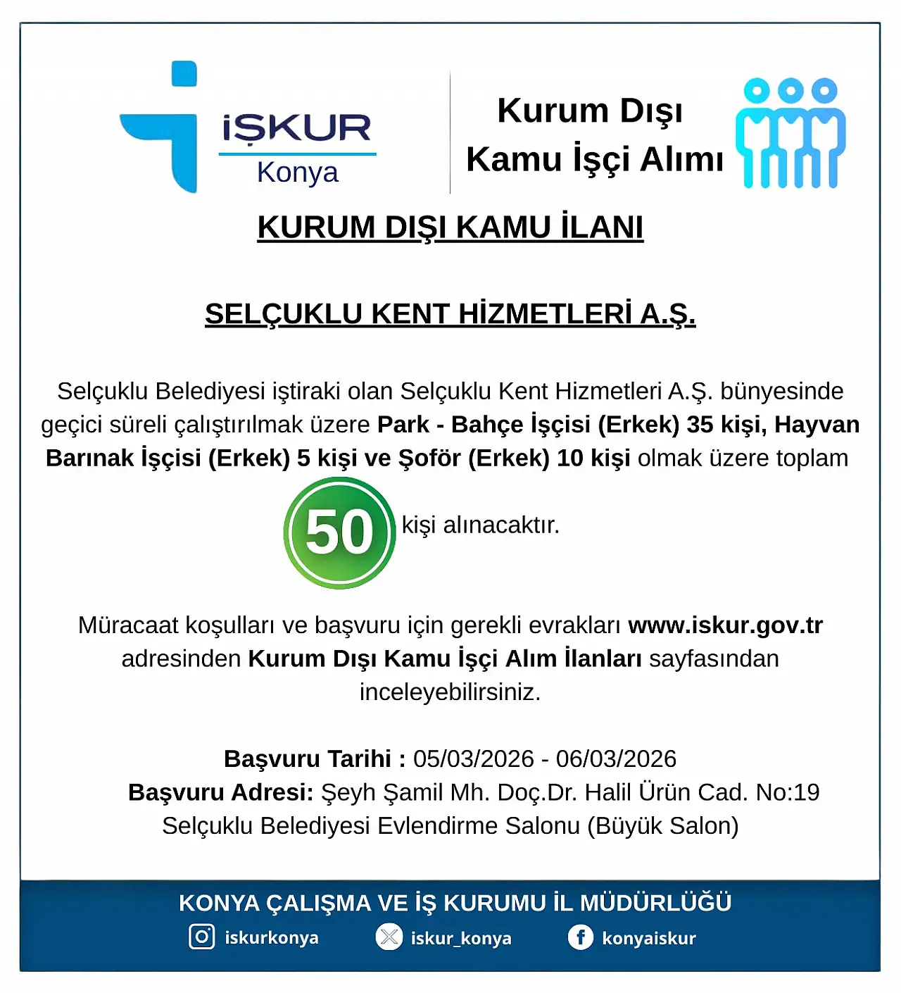 Türkiye İş Kurumu (İŞKUR) Konya İl Müdürlüğü aracılığıyla yayımlanan ilana göre, Selçuklu Kent Hizmetleri A.Ş. bünyesinde geçici süreli çalıştırılmak üzere toplam 50 işçi alımı yapılacak.