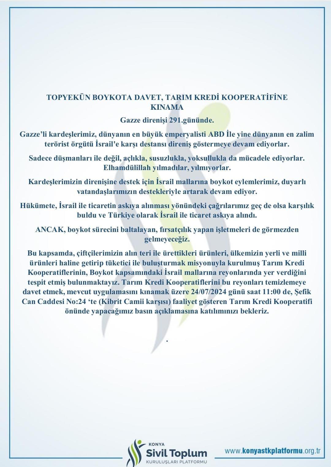 Konya Sivil Toplum Kuruluşları Platformu, Tarım Kredi Kooperatiflerinin, boykot kapsamındaki İsrail mallarına reyonlarında yer vermesi nedeniyle kınamada bulundu