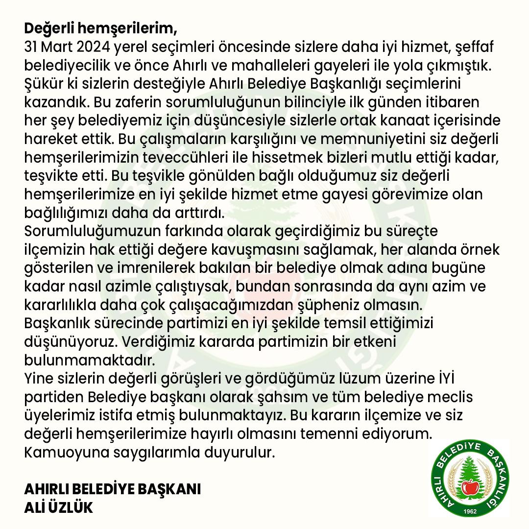 Ahırlı Belediye Başkanı Ali Üzlük İYİ Parti'den istifa ederek, bağımsız olarak devam edeceğini açıkladı. Meclis üyeleriyle birlikte istifa eden Ali Üzlük: