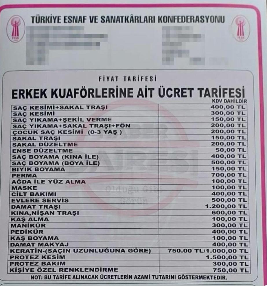 Konya Berberler ve Kuaförler Odası Başkanlığı tarafından yapılan fiyat güncellemesine göre saç kesimi 300 lira olurken, sakal kesimi 150 lira oldu. Saç + sakal kesimi 400 lira olurken, geçen yıl 150 lira olan saç kesimi bu yıl yüzde 100 zamlandı.
