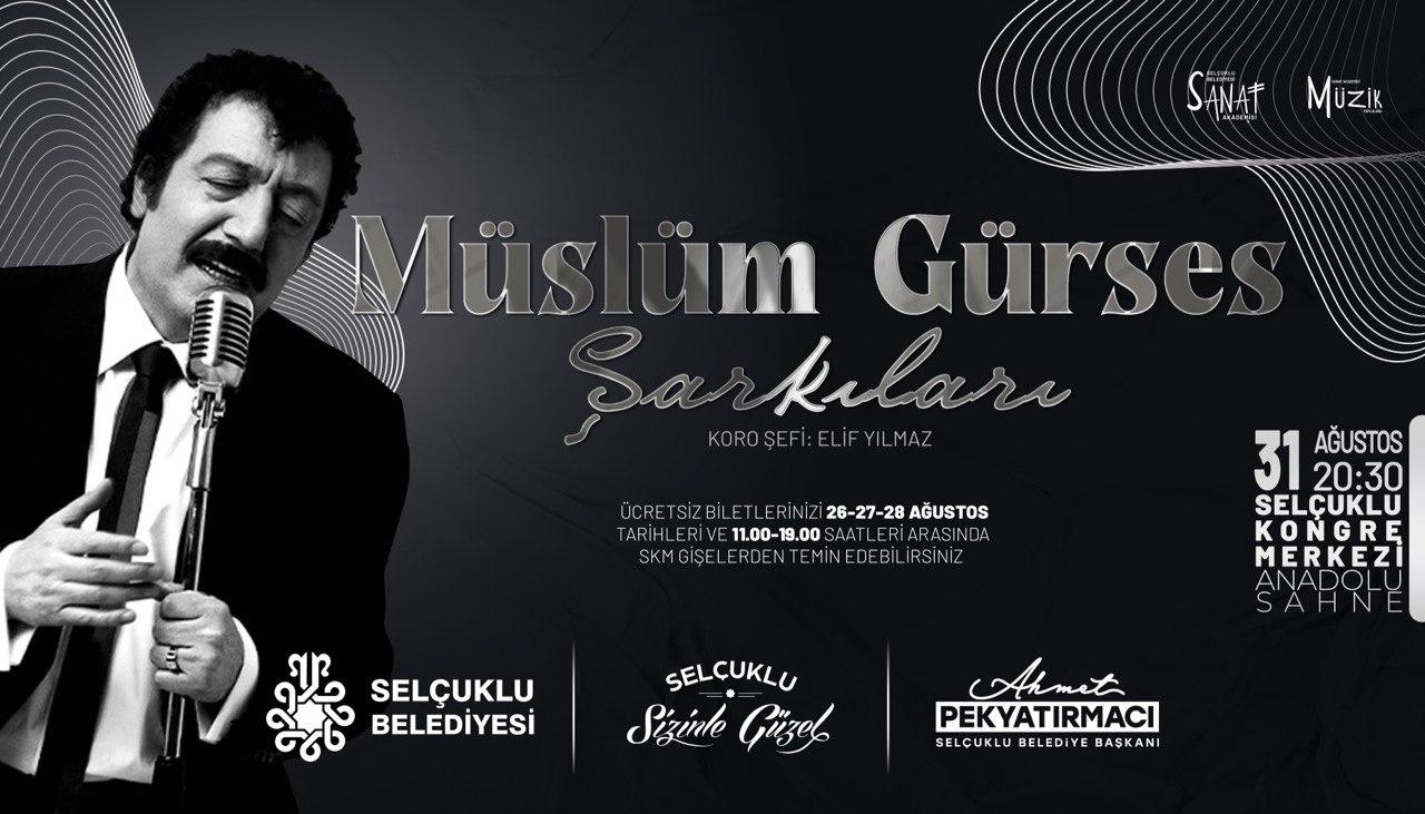 Selçuklu Belediyesi Sanat Akademisi, yıl boyunca ücretsiz olarak düzenlediği bu tür kültür ve sanat organizasyonlarıyla akademide eğitim alan yeteneklerin potansiyellerini keşfetmelerine olanak sağlıyor ve içlerinde taşıdıkları sanat cevherini sahne performanslarıyla sanatseverlerle buluşturmaya devam ediyor. Bu kapsamda daha önce düzenlenen ve Zeki Müren, Ferdi Tayfur ile Barış Manço'nun sevilen eserlerinin seslendirildiği konser serisi büyük ilgi görmüştü. Bu kez de Müslüm Gürses şarkılarıyla sanatseverler, arabesk müziğin duygusal atmosferinde buluşacak.