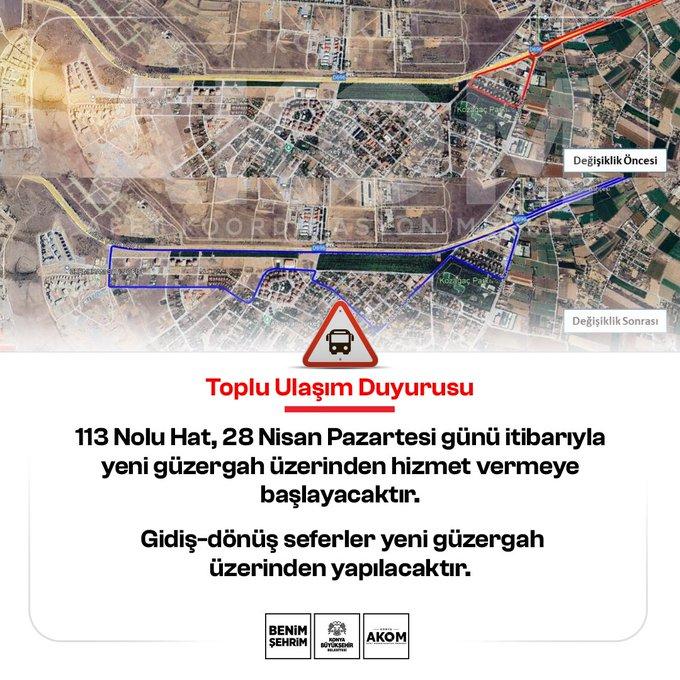 - 113 Nolu hat, 28 Nisan Pazartesi günü itibarıyla yeni güzergah üzerinden hizmet vermeye başlayacaktır.
