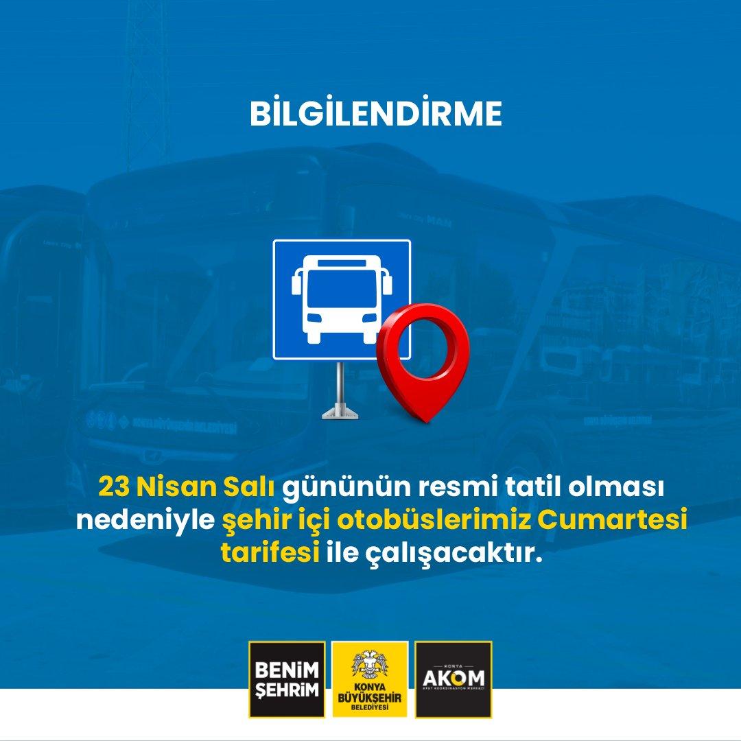 Konya Büyükşehir Belediyesi Afet Koordinasyon Merkezi (AKOM) 23 Nisan Ulusal Egemenlik ve Çocuk Bayramı kapsamında otobüs seferlerinin değişeceğini duyurdu: