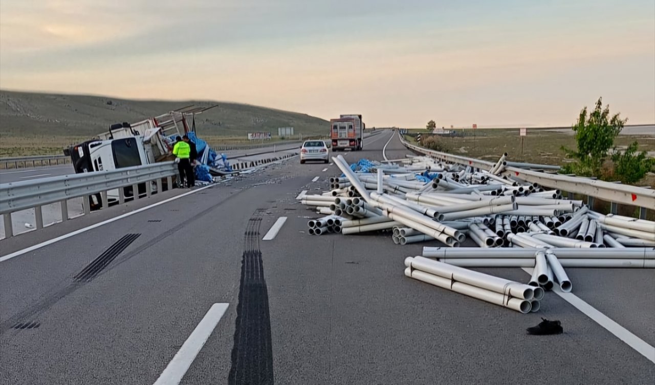 Edinilen bilgiye göre, Ankara - Aksaray D-100 kara yolunun Kulu kavşağı yakınlarında Muhammet Ş. idaresindeki 01 DUU 35 plakalı plastik boru yüklü kamyon henüz sebebi bilinmeyen bir nedenle orta refüjdeki çelik bariyerlere çarparak devrildi.