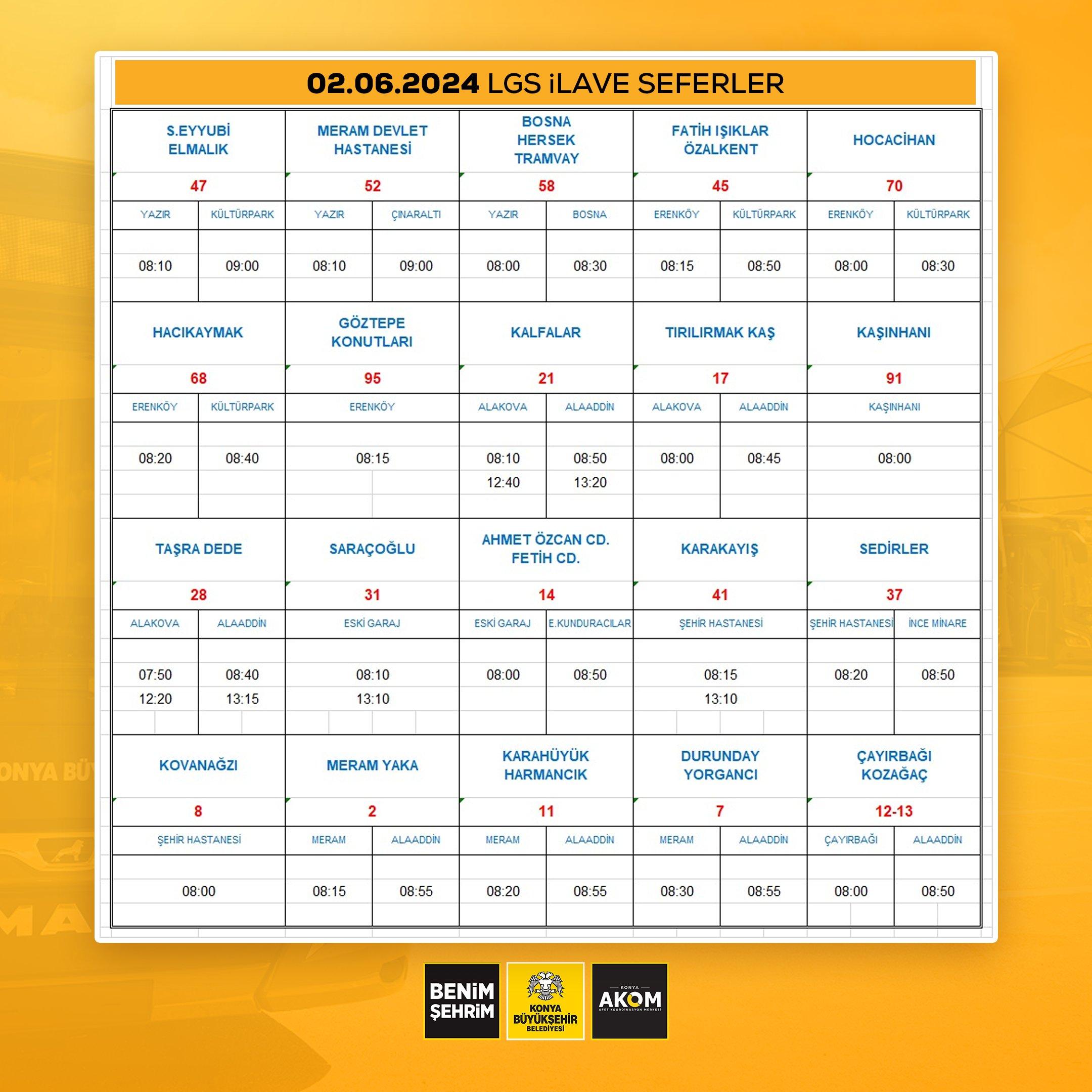 Liselere Geçiş Sistemi (LGS) kapsamındaki merkezi sınav 2 Haziran Pazar günü gerçekleştirilecek.Konya AKOM sınav gününe dair toplu ulaşımda gerçekleştirilen önemli bir duyuru yaptı.1 milyondan fazla öğrencinin katılacağı sınav günü toplu ulaşımdaki sefer sayısı değişikliğine dair duyuruda: