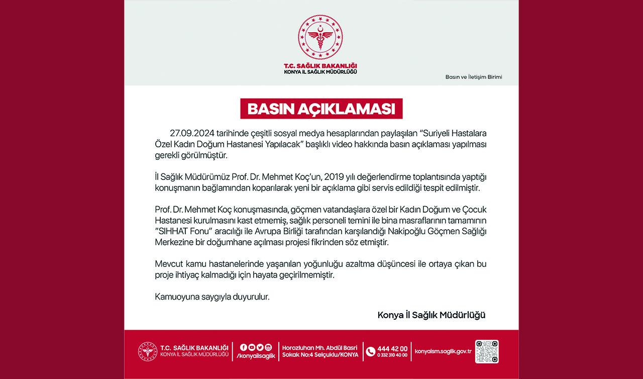 ''27.09.2024 tarihinde çeşitli sosyal medya hesaplarından paylaşılan "Suriyeli Hastalara Özel Kadın Doğum Hastanesi Yapılacak" başlıklı video hakkında basın açıklaması yapılması gerekli görülmüştür.