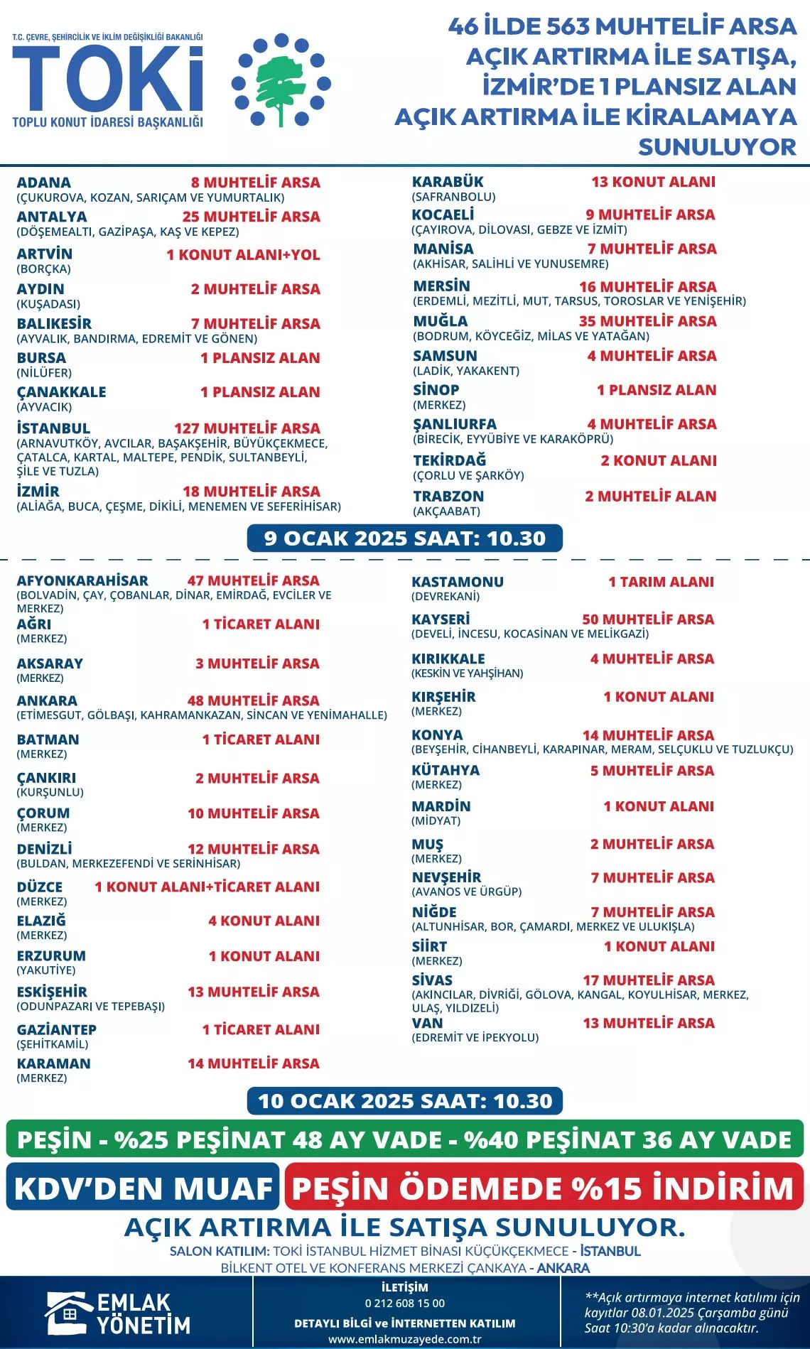 Açık artırmalar, 9-10 Ocak 2025 tarihlerinde saat 10.30'da Ankara Bilkent Otel ile TOKİ İstanbul Hizmet Binası'nda yapılacak. Ayrıca internetten üzerinden de (www.emlakmuzayede.com.tr) teklif verilebilecek.