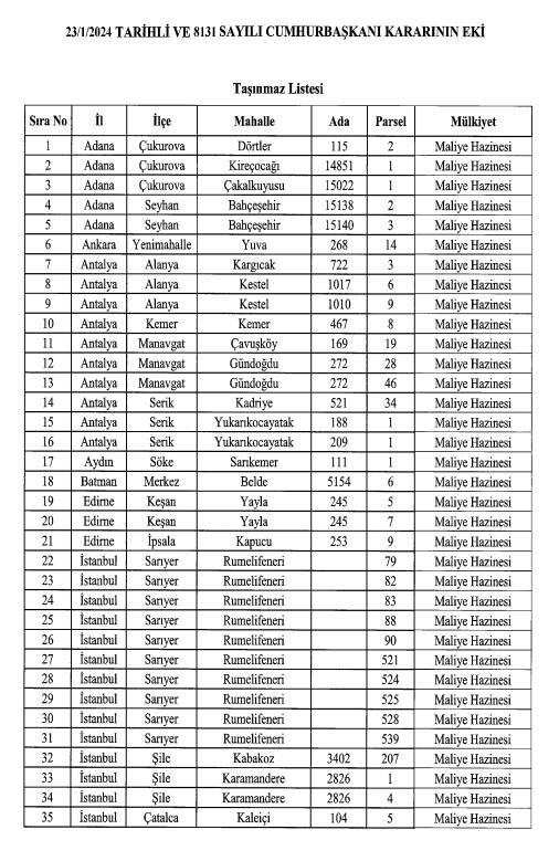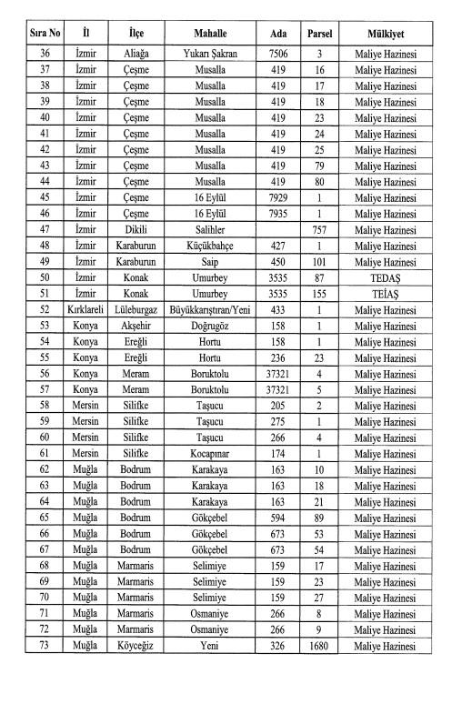 Kararı kapsayan iller: Adana, Ankara, Antalya, Aydın, Batman, Edirne İstanbul, İzmir, Kırklareli, Konya, Mersin ve Muğla illerinde yer alıyor. Özelleştirme kararı kapsamındaki taşınmazların bazıları, İstanbul Sarıyer Rumeli Feneri, İzmir Çeşme, Muğla'da da Bodrum, Köyceğiz ve Marmaris'te, Antalya Kemer ve Manavgat ve Alanya'da, Ankara Yenimahalle olarak belirlendi.