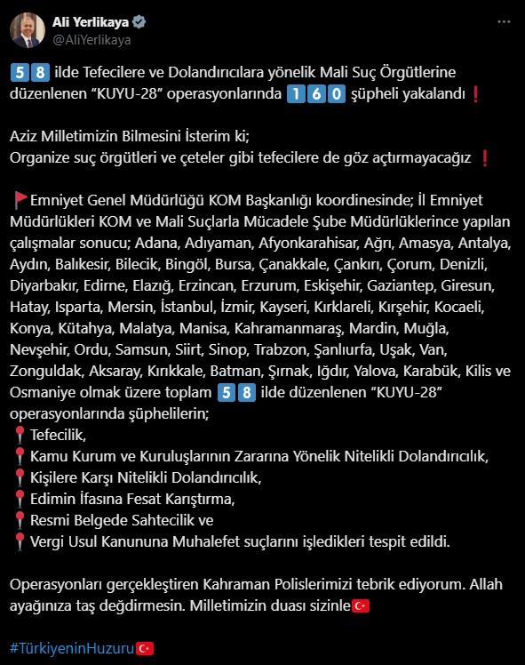 İçişleri Bakanı Ali Yerlikaya, 58 ilde tefecilere, dolandırıcılara ve mali suç örgütlerine yönelik düzenlenen "Kuyu-28" operasyonlarında 160 şüphelinin yakalandığını bildirdi.Yerlikaya, sosyal medya hesabından yaptığı paylaşımda, Emniyet Genel Müdürlüğü, İl Emniyet Müdürlükleri ve Mali Suçlarla Mücadele Şube Müdürlüklerince yapılan çalışmalar sonucu İstanbul, İzmir ve Manisa'nın da aralarında bulunduğu 58 ilde gerçekleştirilen operasyonlarda, şüphelilerin "tefecilik, kamu kurum ve kuruluşlarının zararına yönelik nitelikli dolandırıcılık, kişilere karşı nitelikli dolandırıcılık, edimin ifasına fesat karıştırma, resmi belgede sahtecilik ve vergi usul kanununa muhalefet" suçlarını işlediklerinin tespit edildiğini belirtti.