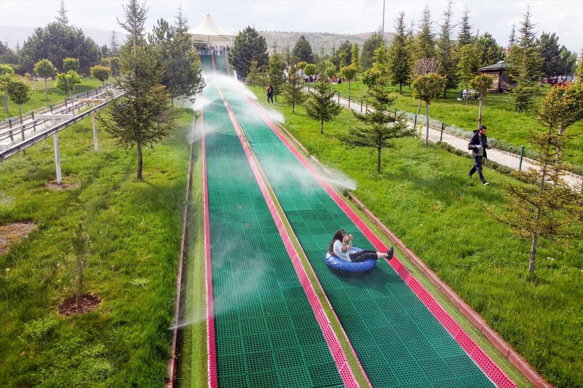 Suni çimden oluşan eğimli parkurda, şişme botla kayanlar, zemini kayganlaştırmak için püskürtülen su sayesinde serinleme fırsatı da buluyor.