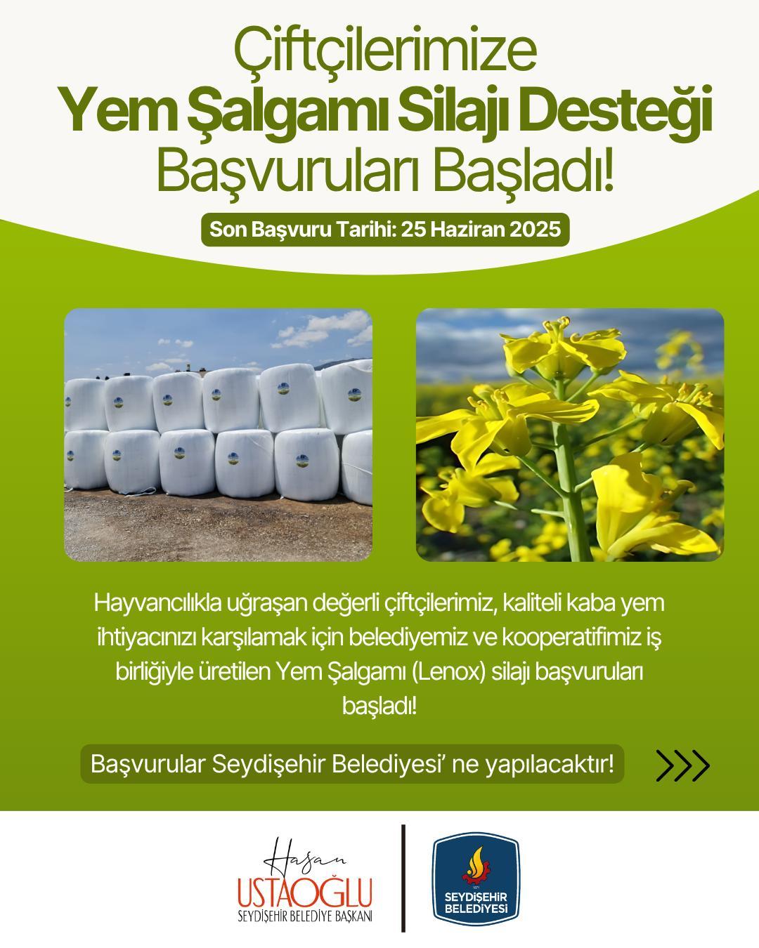 Başkan Ustaoğlu, "kırsal kalkınmayı destekleme ve yerli üreticilerin yanında olma hedefiyle Yem Şalgamı (Lenox) Silajı Desteği başvurularımız başladı. İlçemizde hayvancılıkla uğraşan çiftçilere yönelik sağlanacak bu destekle kaliteli kaba yem ihtiyacının büyük bölümü karşılanmış olacak. Belediye ve kooperatif iş birliğiyle üretilen silajlar için başvurular, Belediyemize şahsen yapılacak.