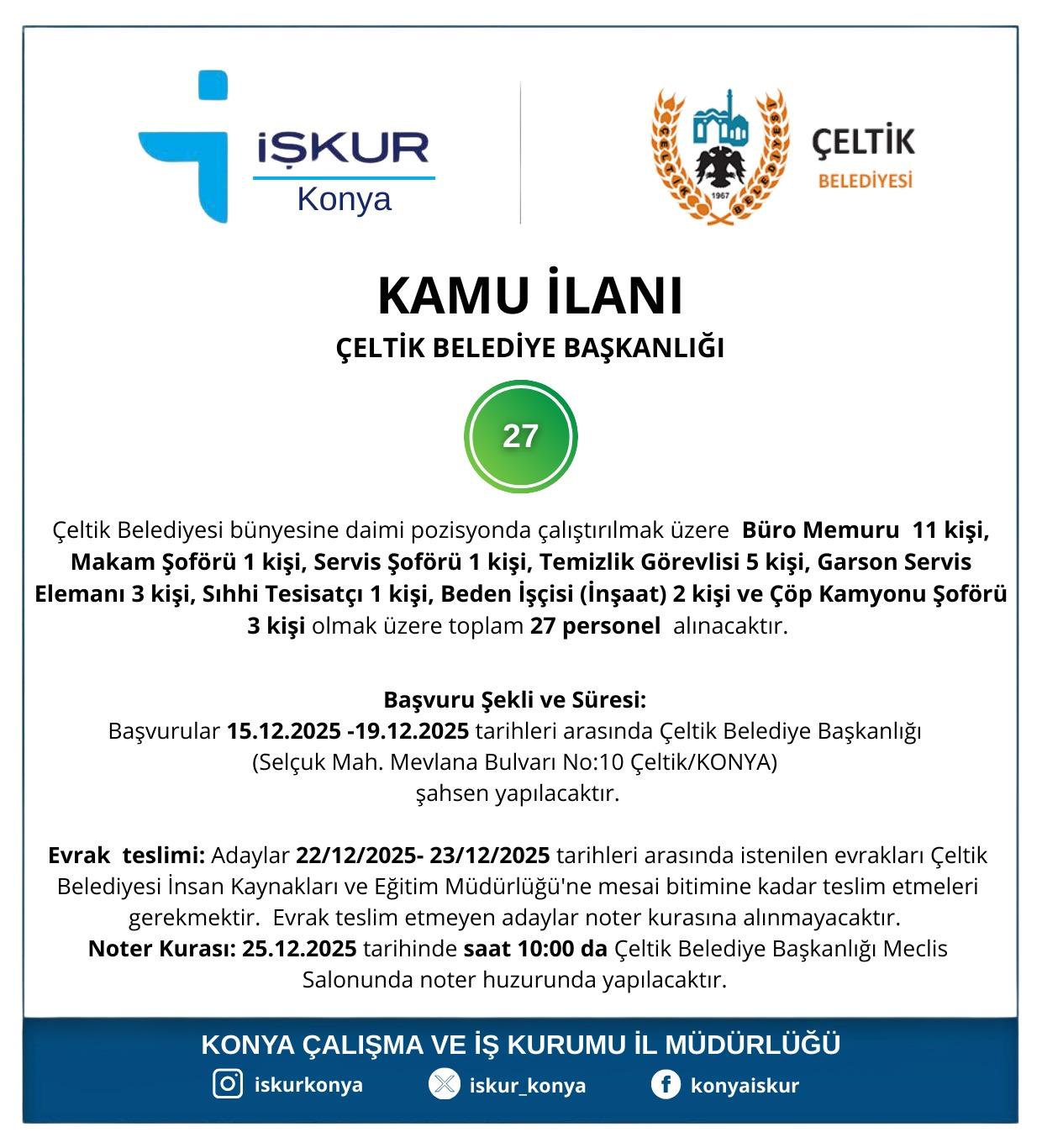 Personel alımı için noter huzurunda yapılacak kura çekimi ise 25 Aralık 2025 Perşembe günü saat 10.00'da Çeltik Belediye Başkanlığı Meclis Salonu'nda gerçekleştirilecek.