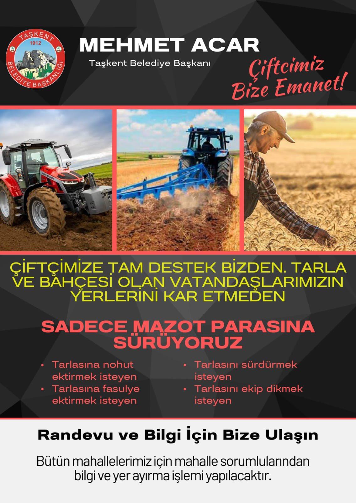 Konya'nın Taşkent ilçesinde tarlalar ücretsiz sürülecek. Taşkent Belediye Başkanı Mehmet Acar müjdeyi sosyal medya hesaplarından duyurdu: