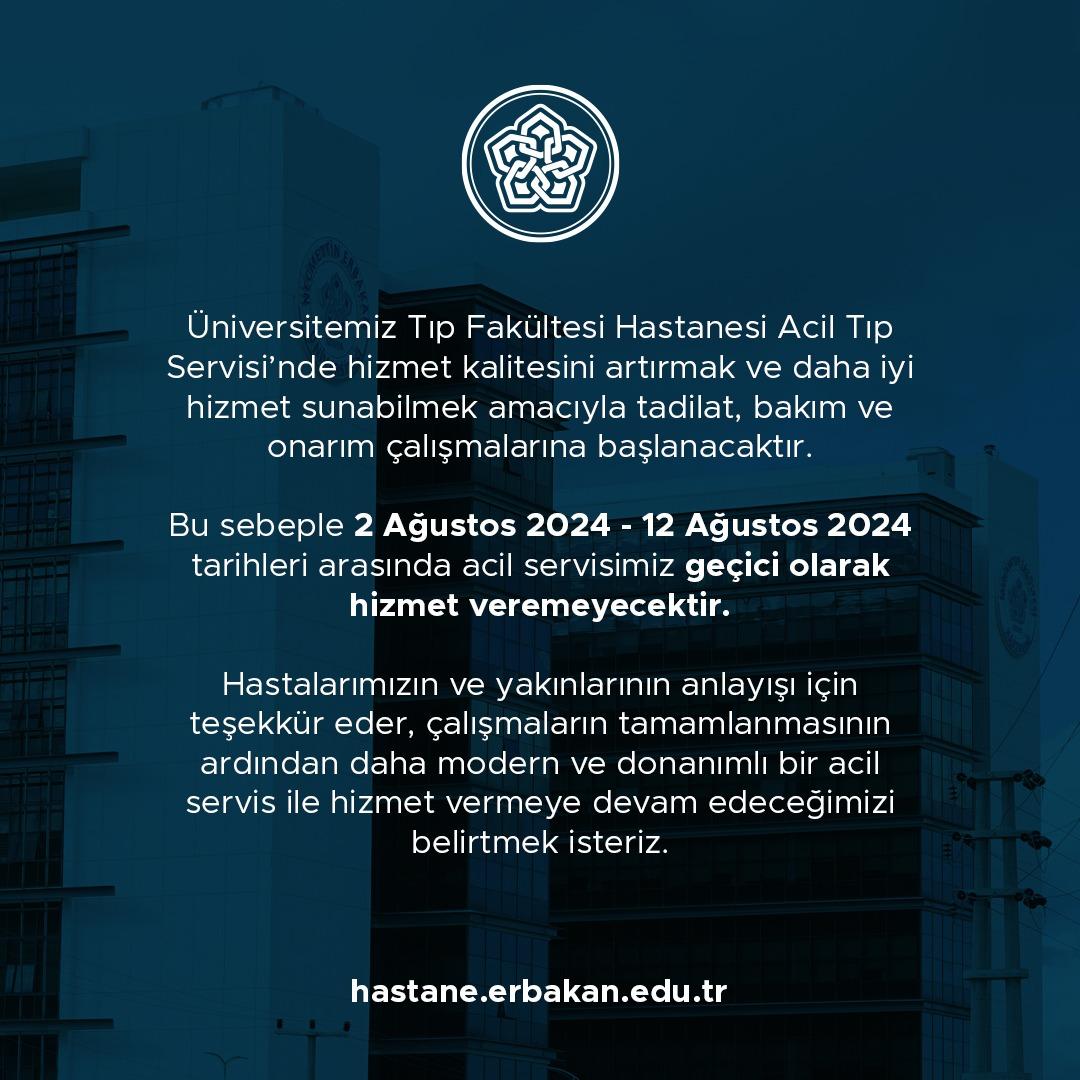 ‘'Necmettin Erbakan Üniversitesi Tıp Fakültesi Hastanesi Acil Tıp Servisi'nde hizmet kalitesini artırmak ve daha iyi hizmet sunabilmek amacıyla tadilat, bakım ve onarım çalışmalarına başlanacaktır. Bu sebeple 2 Ağustos 2024 - 12 Ağustos 2024 tarihleri arasında acil servisimiz geçici olarak hizmet veremeyecektir.