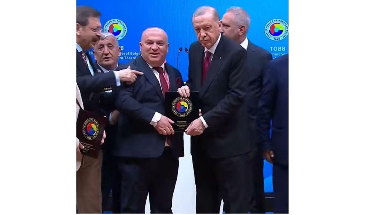 Türkiye Odalar ve Borsalar Birliği (TOBB) tarafından düzenlenen Hizmet Şeref Belgesi ve Plaketi Takdim Töreni'nde, Çelikkayalar Yönetim Kurulu Başkanı Ali Kaya, ödülünü Cumhurbaşkanı Recep Tayyip Erdoğan'ın elinden aldı.