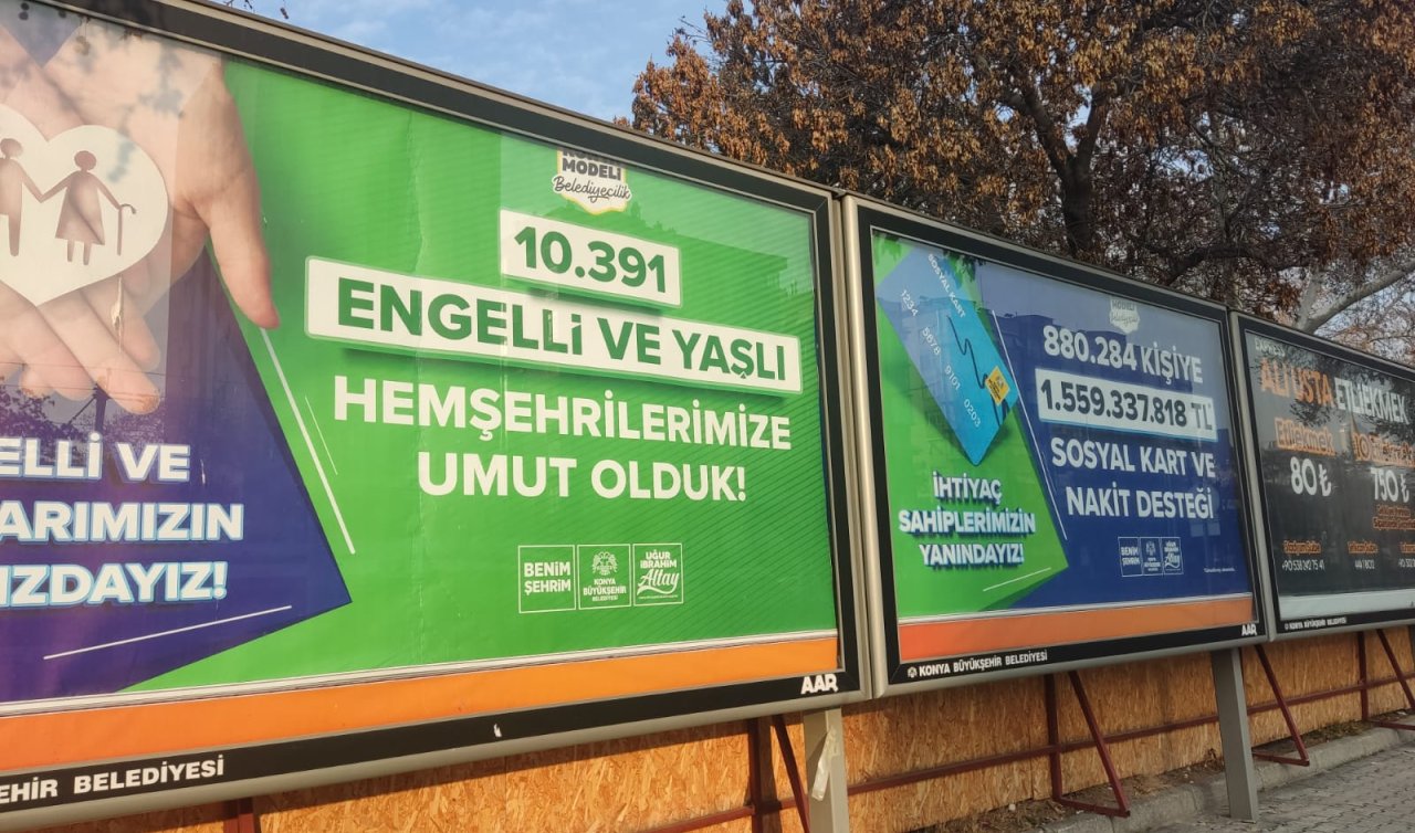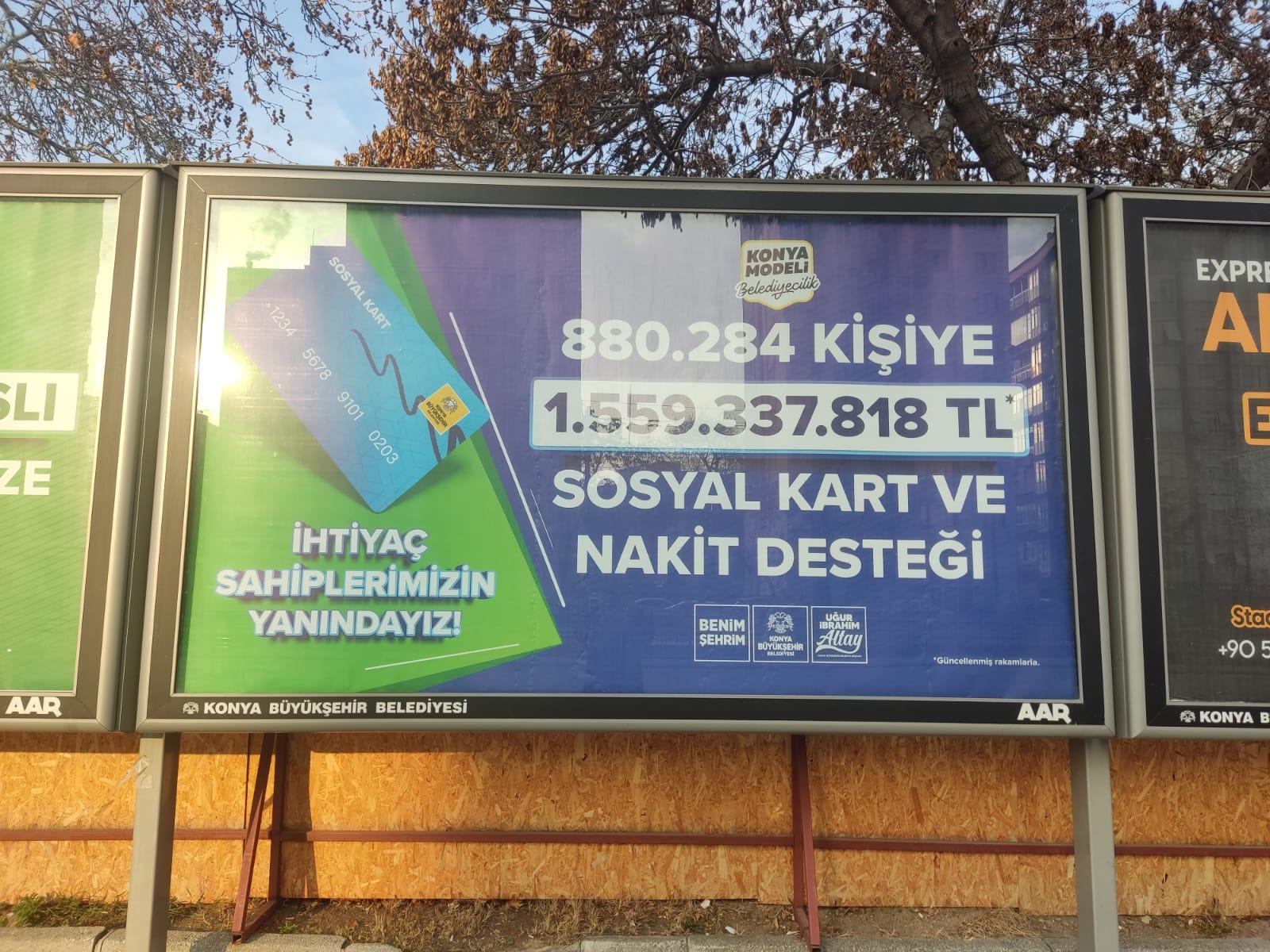 Konya Büyükşehir Belediyesi'nin, şehirdeki sosyal yardım miktarlarını duyurduğu bilbordlardaki reklamlar, vatandaşlar arasında kafaları karıştırdı. Belediye tarafından duyurulan rakamlara göre, Konya'da 880.284 kişiye toplamda 1 milyar 559 milyon 337 bin 818 TL değerinde sosyal kart ve nakit desteği sağlandığı bildirildi. Bu, yaklaşık 2,3 milyon nüfuslu bir şehirde, toplam nüfusun üçte birinden fazlasına yardım yapıldığı anlamına geliyor.