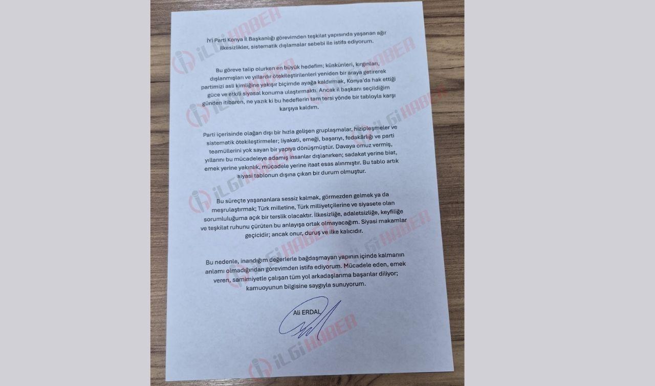 İYİ Parti Konya İl Başkanı Ali Erdal, teşkilat yapısında yaşanan "ağır ilkesizlikler ve sistematik dışlamalar” gerekçesiyle görevinden istifa ettiğini açıkladı.