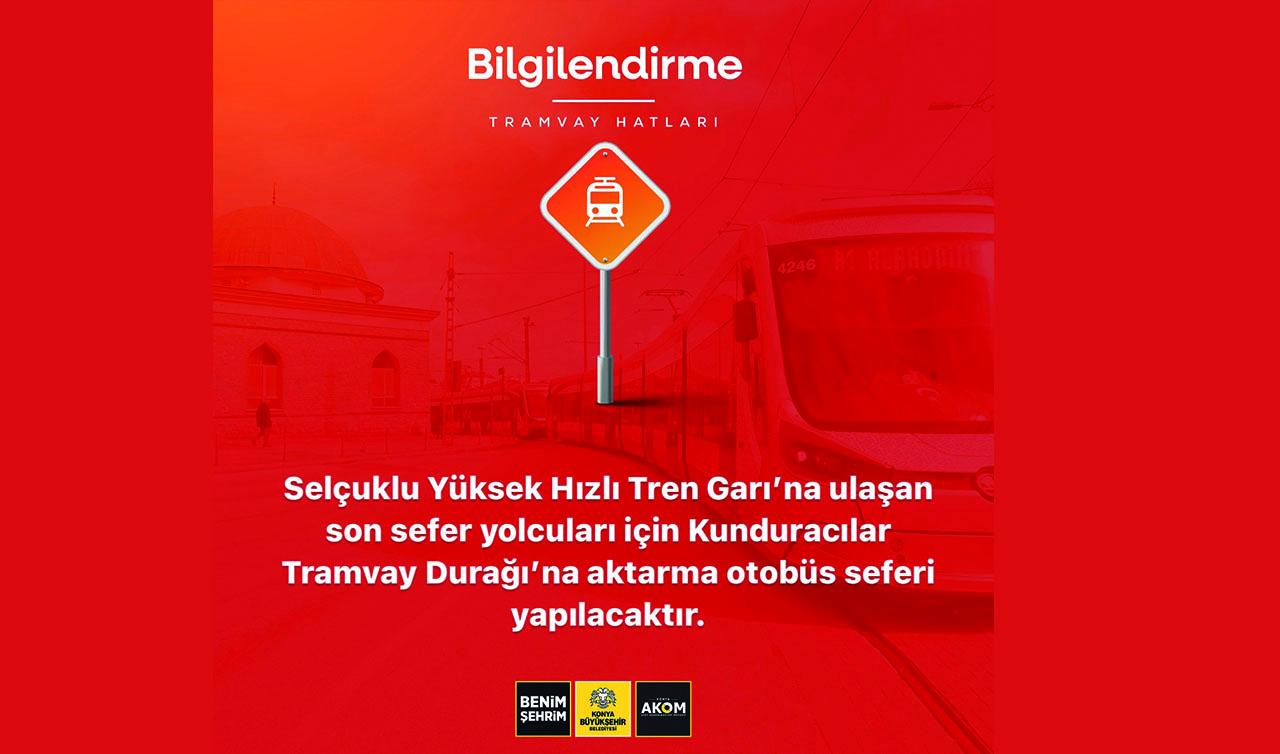 Selçuklu Yüksek Hızlı Tren Garı'na ulaşan son sefer yolcuları için Kunduracılar Tramvay Durağı'na aktarma otobüs seferi yapılacaktır.
