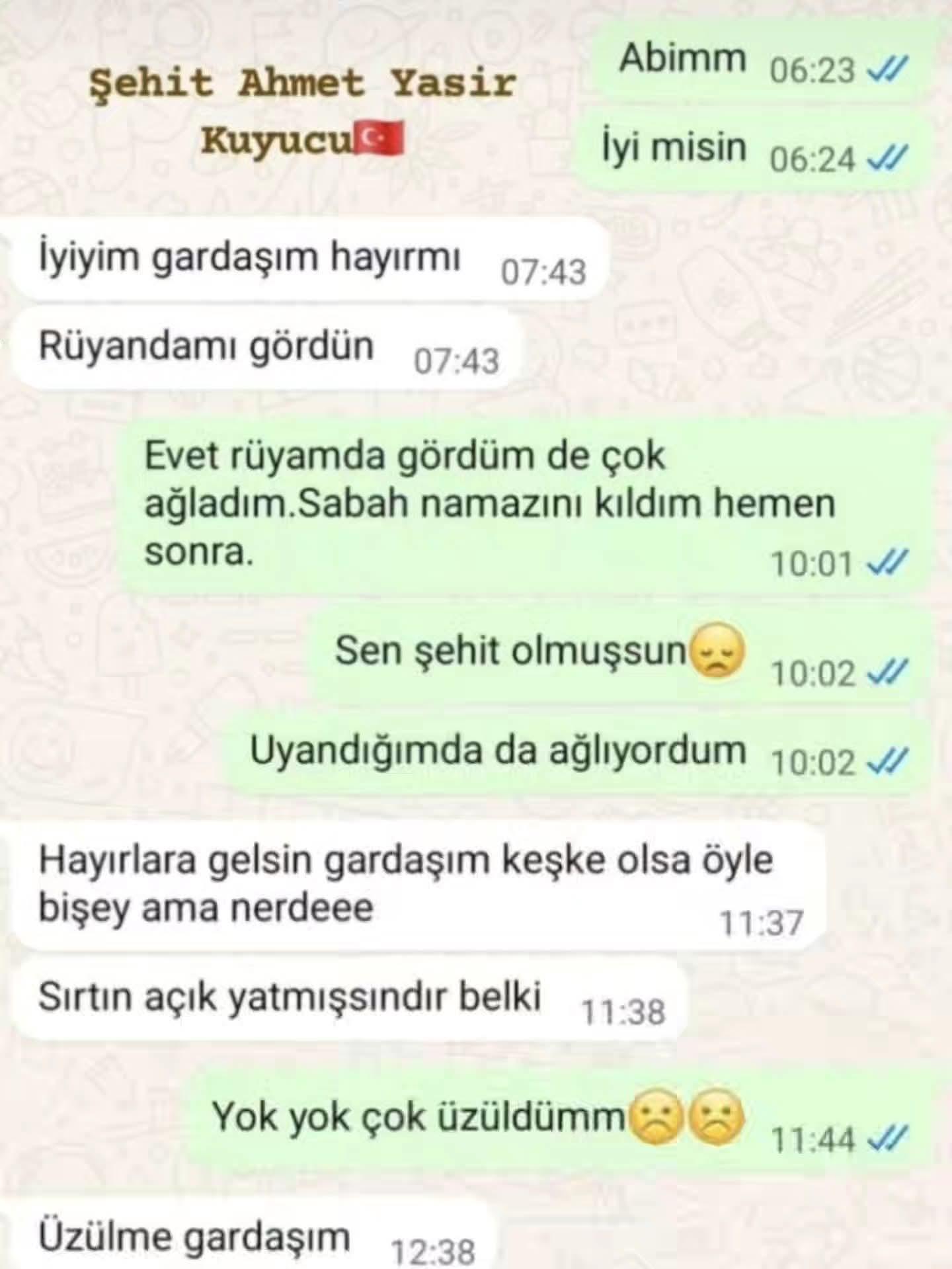 Konyalı şehidin kız kardeşi, sabah erken saatlerde ağabeyine "Abimm, iyi misin?” diye mesaj attı. Şehit Kuyucu, "İyiyim gardaşım, hayır mı? Rüyanı mı gördün?” diyerek karşılık verdi. Bunun üzerine kız kardeşi, gördüğü rüyayı anlatarak, "Evet rüyamda gördüm de çok ağladım… Sen şehit olmuşsun. Uyandığımda da ağlıyordum.” ifadelerini paylaştı.